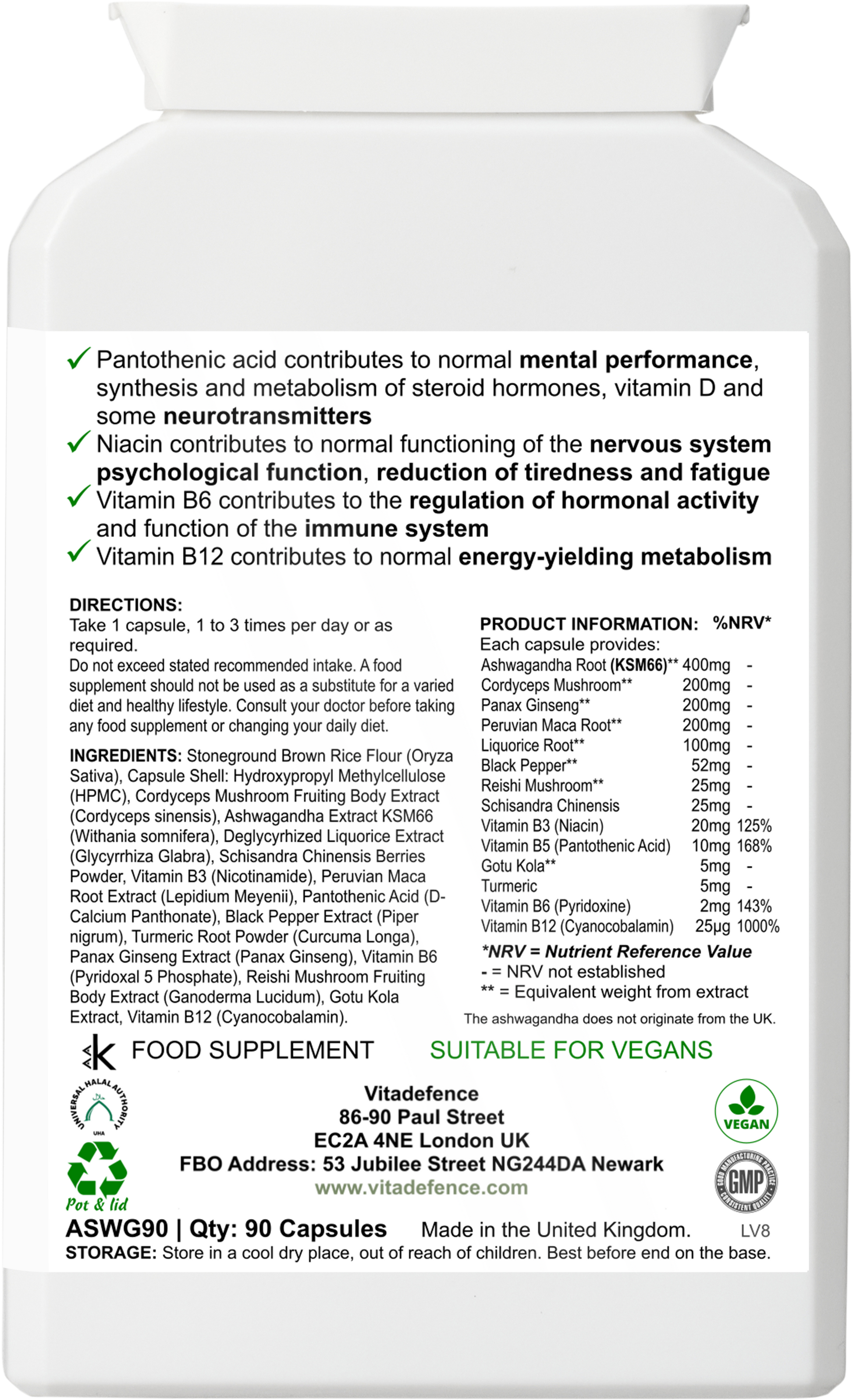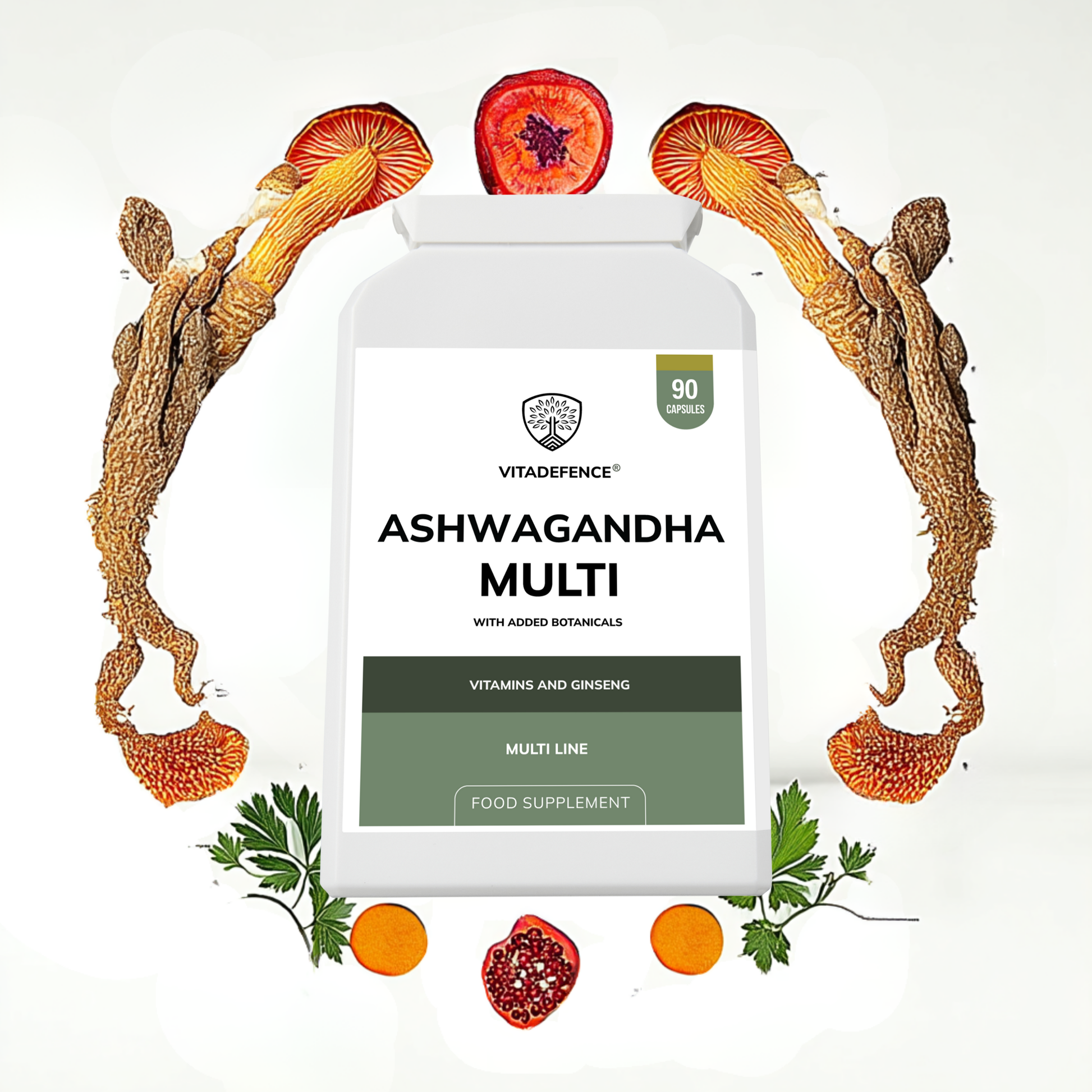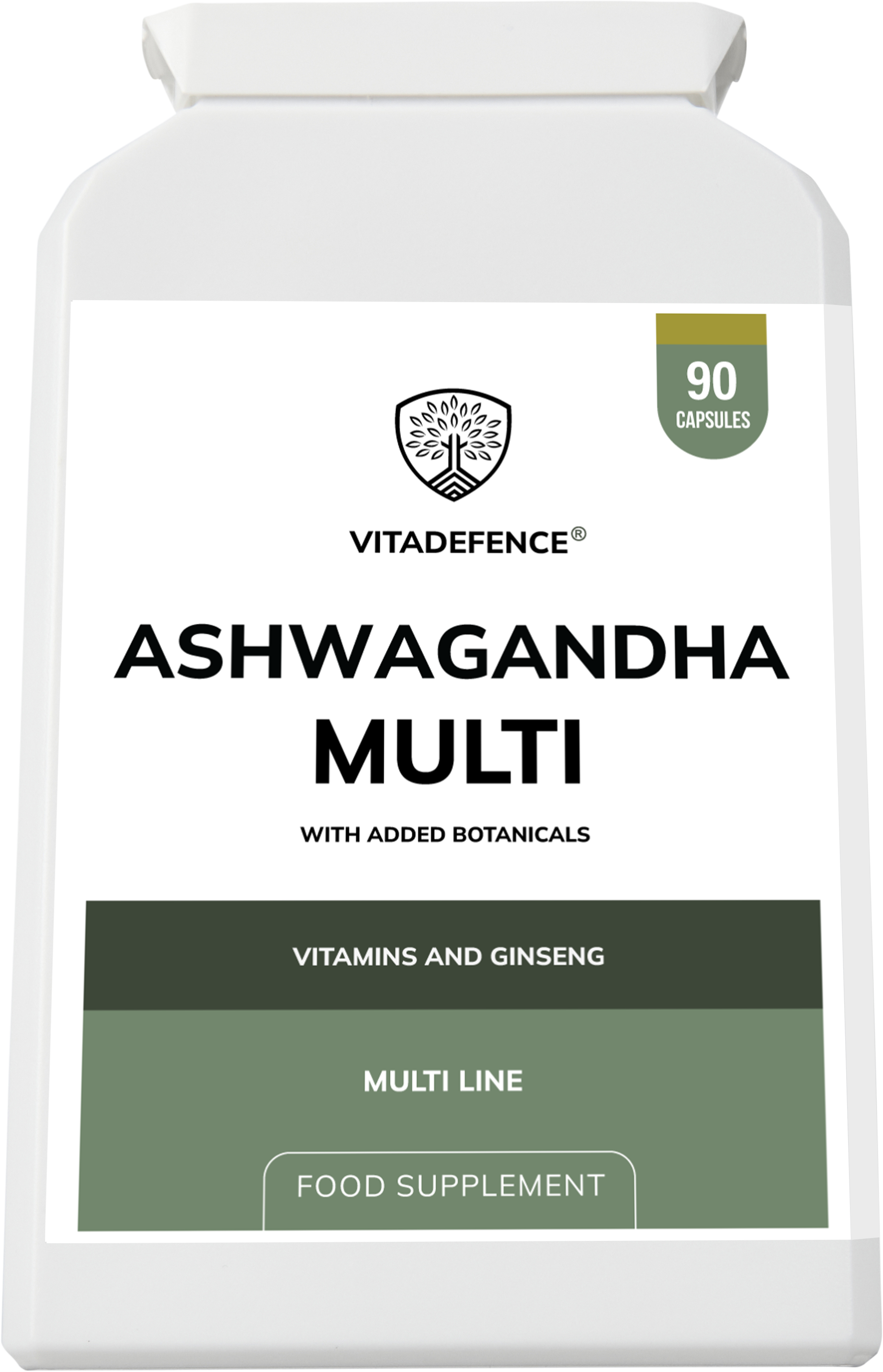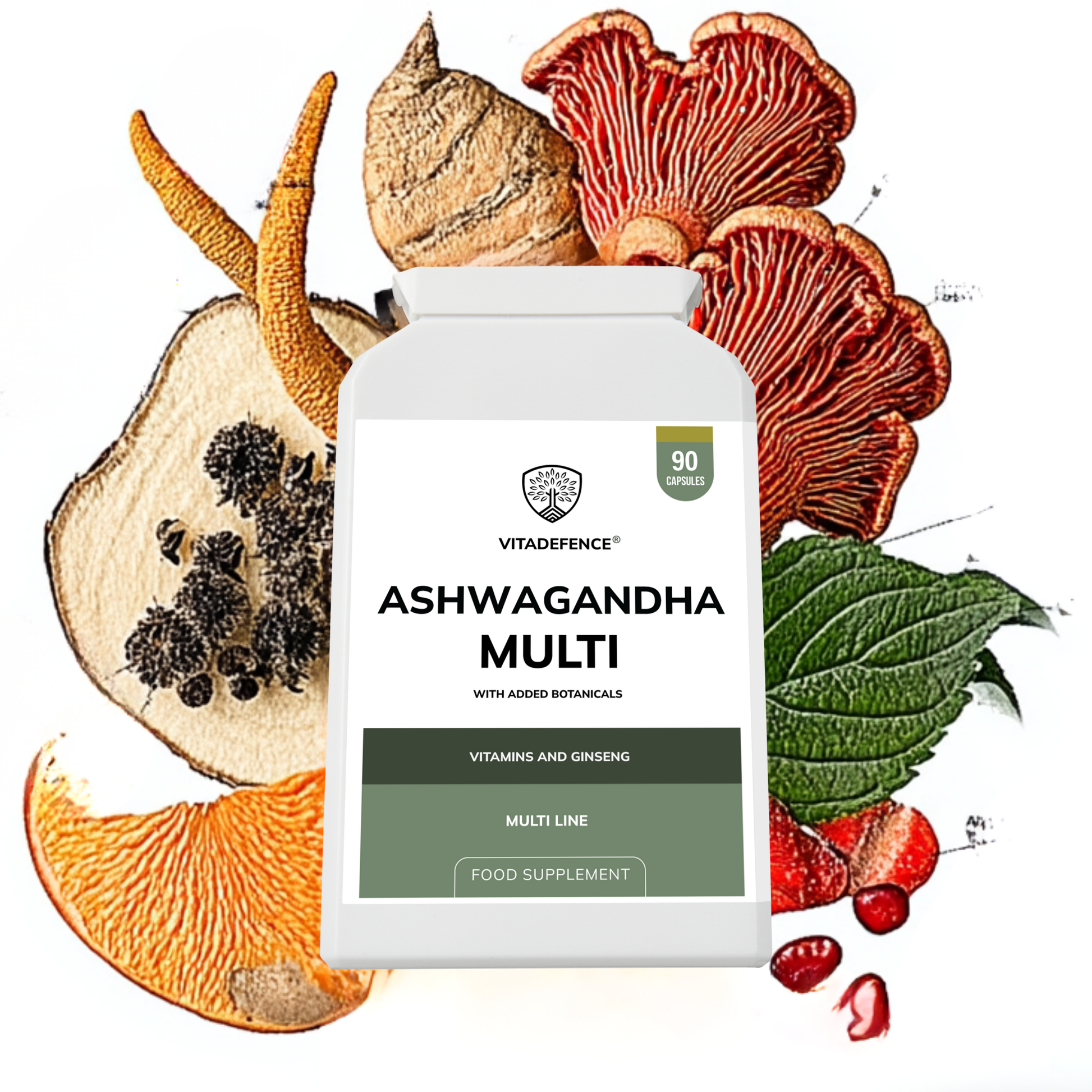 Vitadefence® Ashwagandha Multi is a vegan capsule food supplement, manufactured in the UK to GMP standards. This balanced formula combines KSM-66® ashwagandha root extract with Panax ginseng, cordyceps, maca, and key vitamins, presented in a clean, plant-based blend.