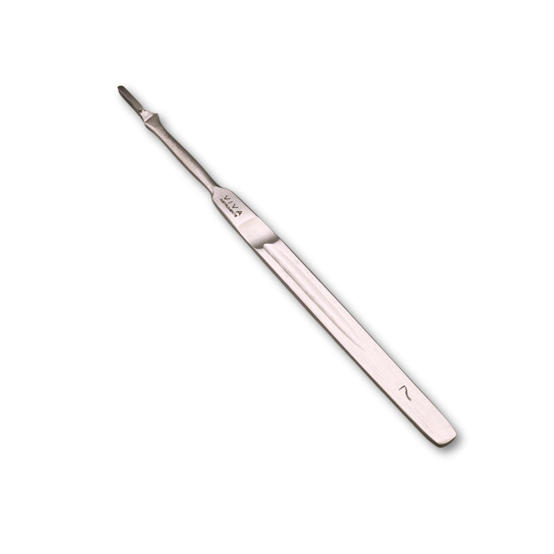 The No. 7 scalpel handle is characterized by its long, slender, and slightly tapered design, making it ideal for precision work in confined spaces. It is commonly used in plastic surgery, ophthalmic procedures, and other delicate operations. The handle's fine tip allows for accurate blade placement, while its stainless steel construction ensures durability and ease of sterilization.