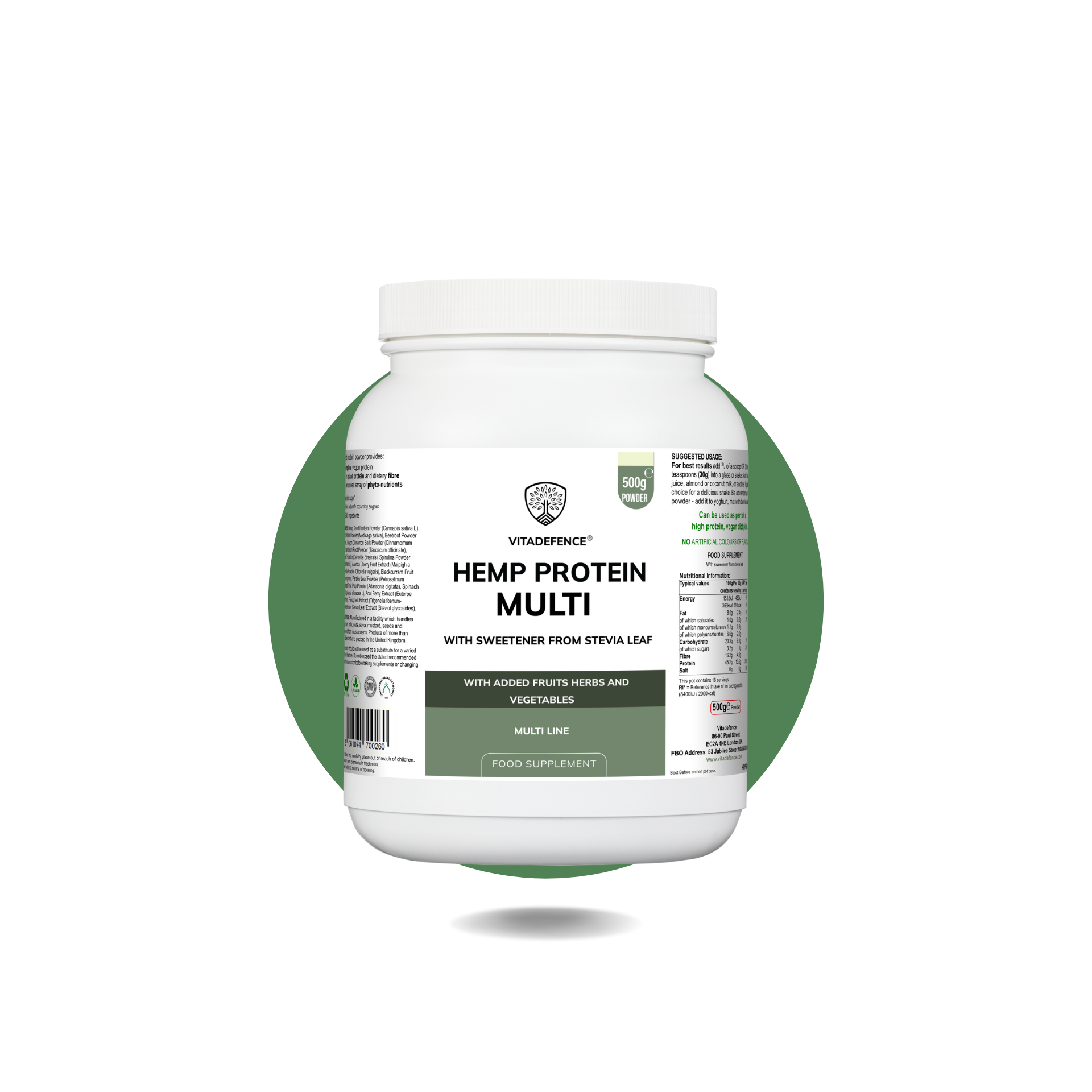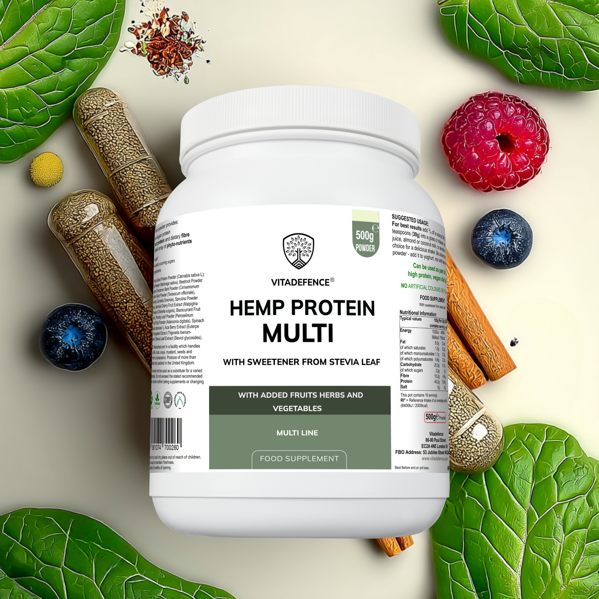 Vitadefence® Hemp Protein Multi is a plant-based protein supplement, manufactured in the UK to GMP standards. Each serving provides complete hemp protein with naturally occurring fibre and phytonutrients from a carefully selected blend of fruits, herbs, and vegetables. Protein contributes to the growth and maintenance of muscle mass and the maintenance of normal bones. This clean, plant-powered formula contains no added sugar and no artificial colours or flavours, making it a versatile choice to add to shakes, smoothies, or recipes.