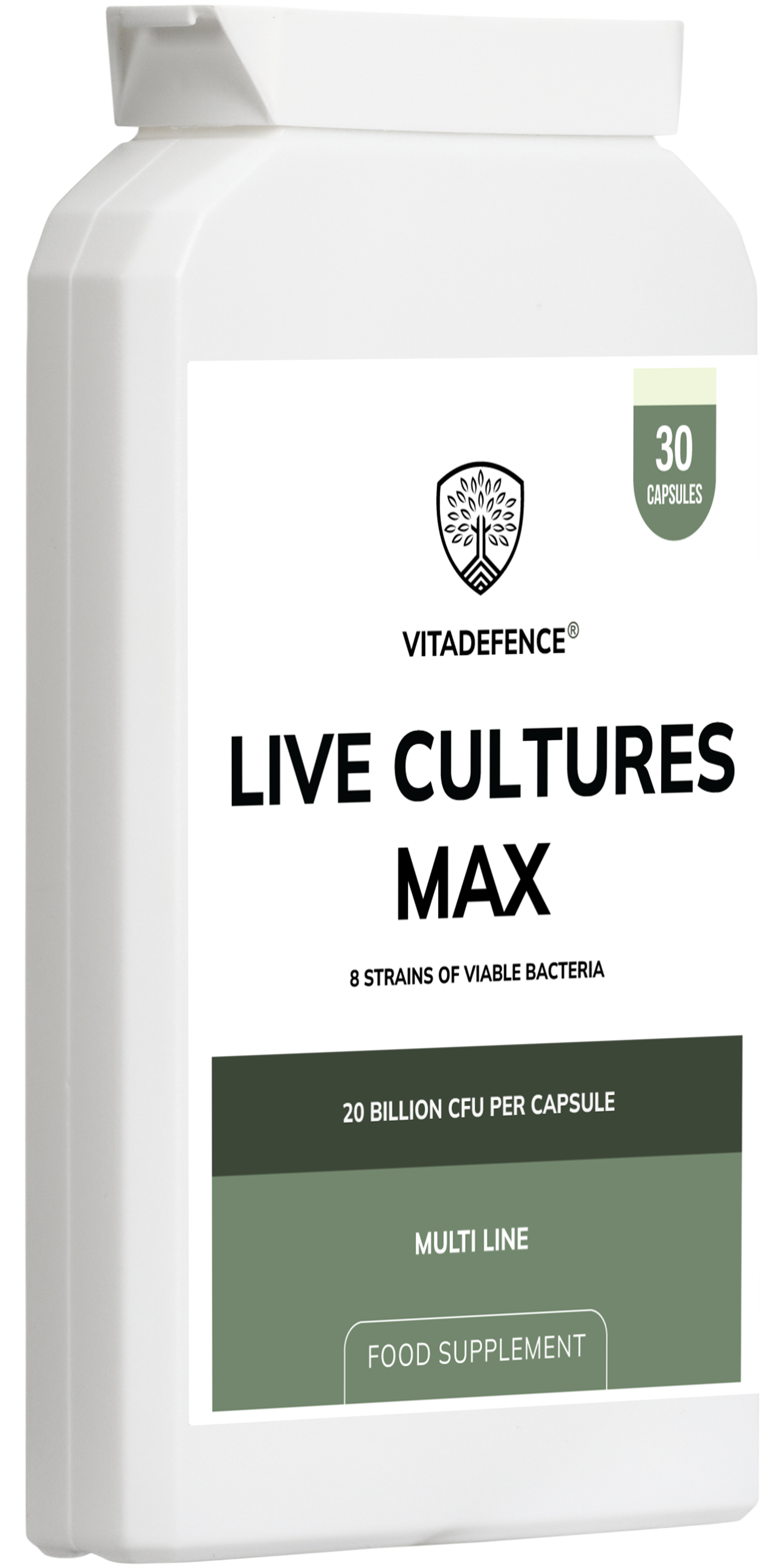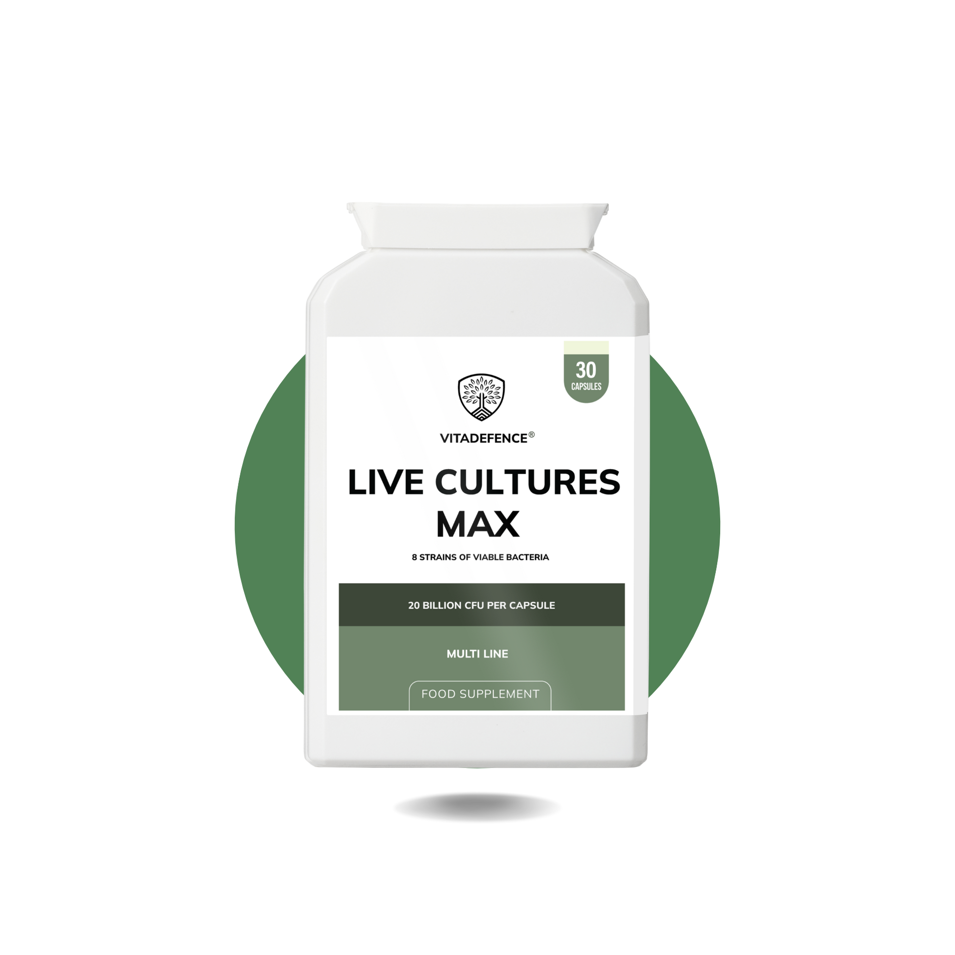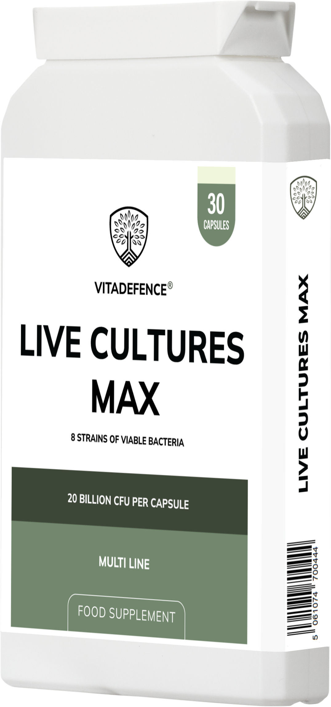 Vitadefence Live Cultures Max provides 8 live bacterial strains, delivering 20 billion CFU per capsule.