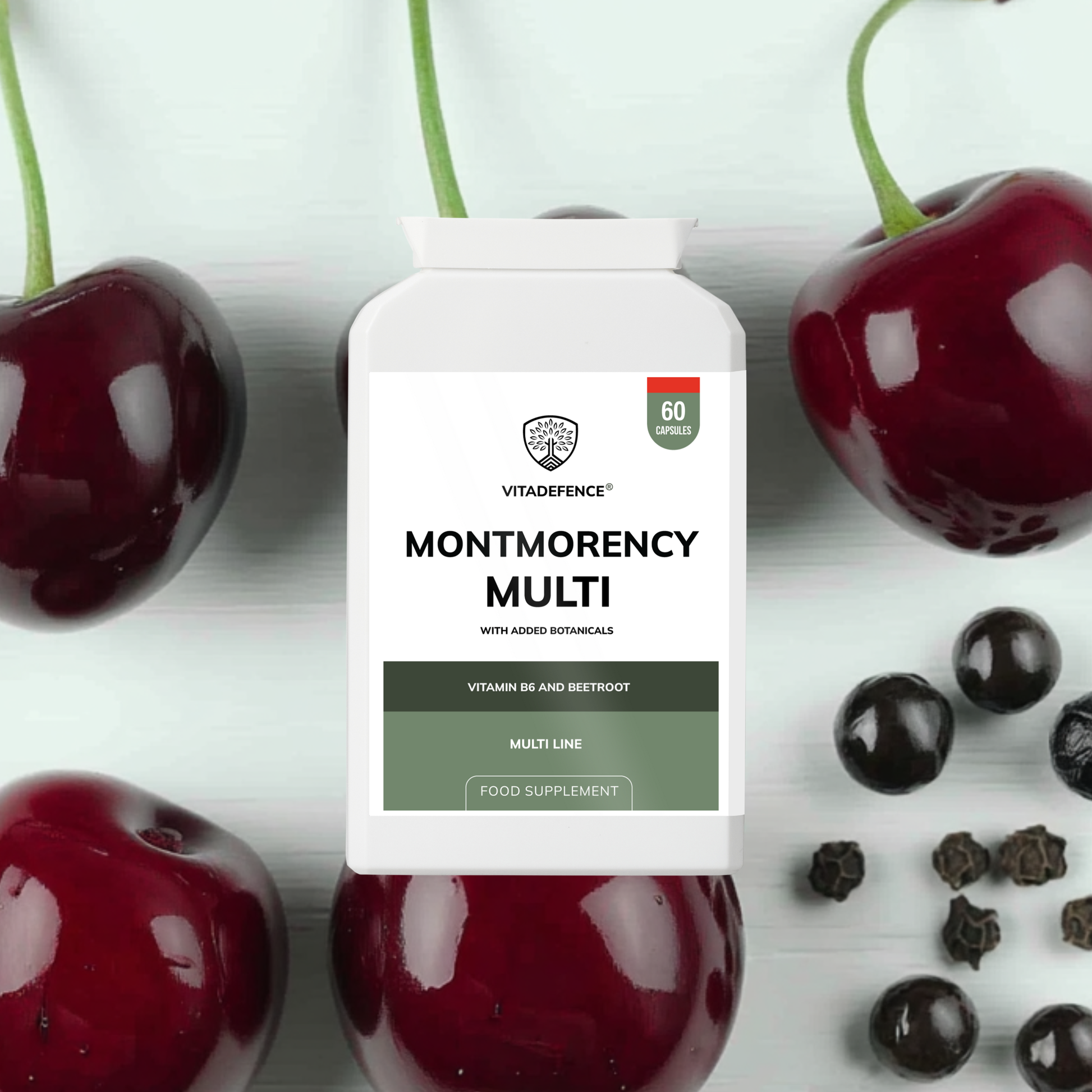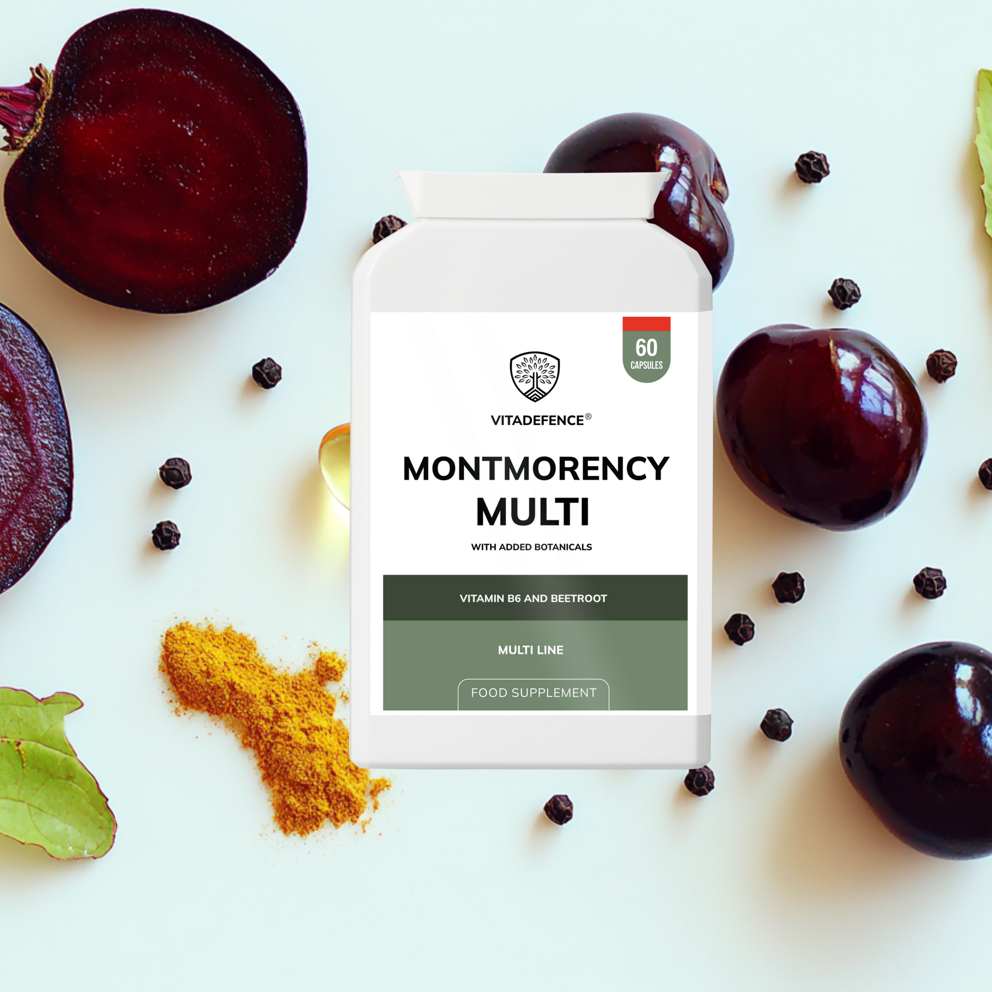 Vitadefence Montmorency Multi combines Montmorency cherry, beetroot, turmeric, and black pepper.