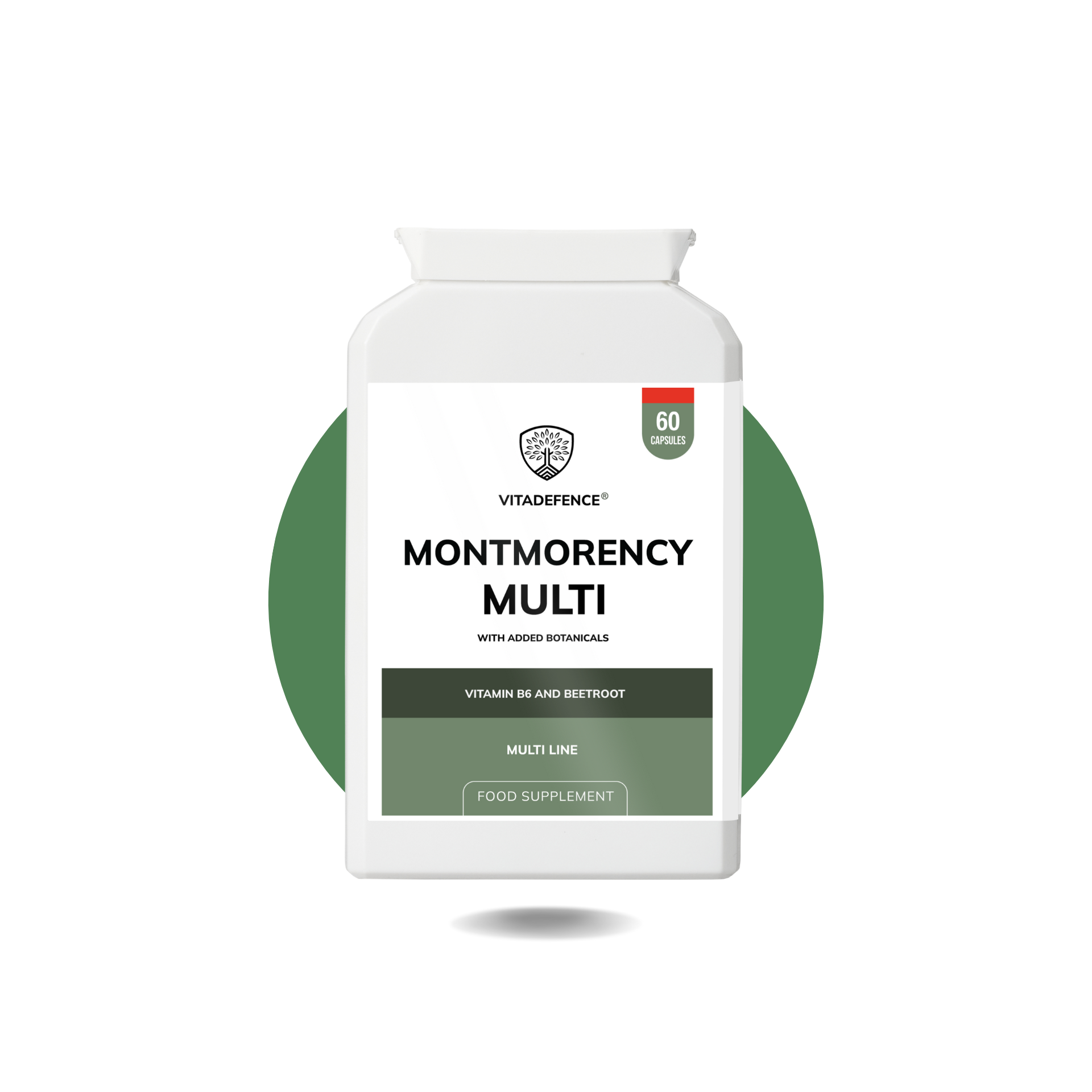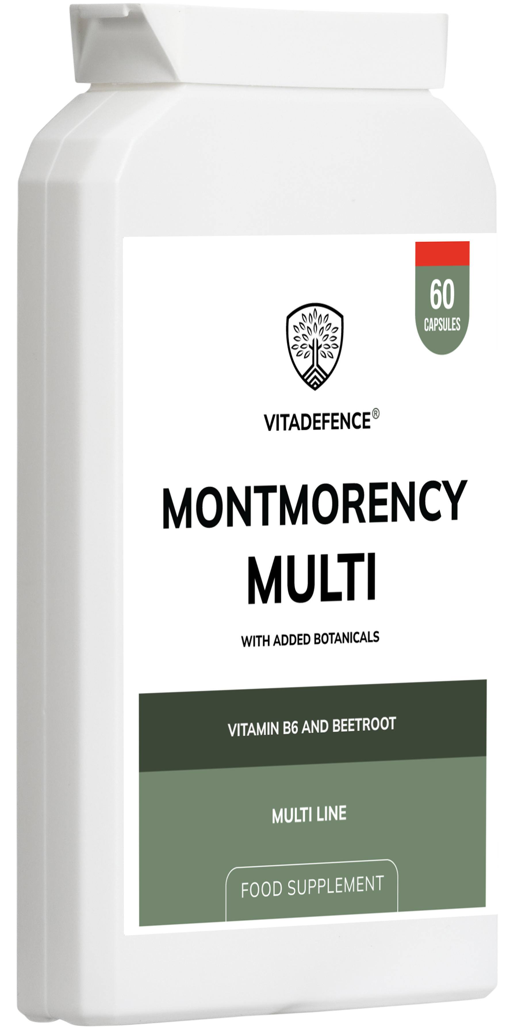 Vitadefence® Montmorency Multi is a vegan capsule food supplement, manufactured in the UK to GMP standards. This daily formula combines beetroot, Montmorency cherry, turmeric, and black pepper with vitamin B6. Vitamin B6 contributes to normal energy-yielding metabolism, the reduction of tiredness and fatigue, and the normal function of the immune system and nervous system.