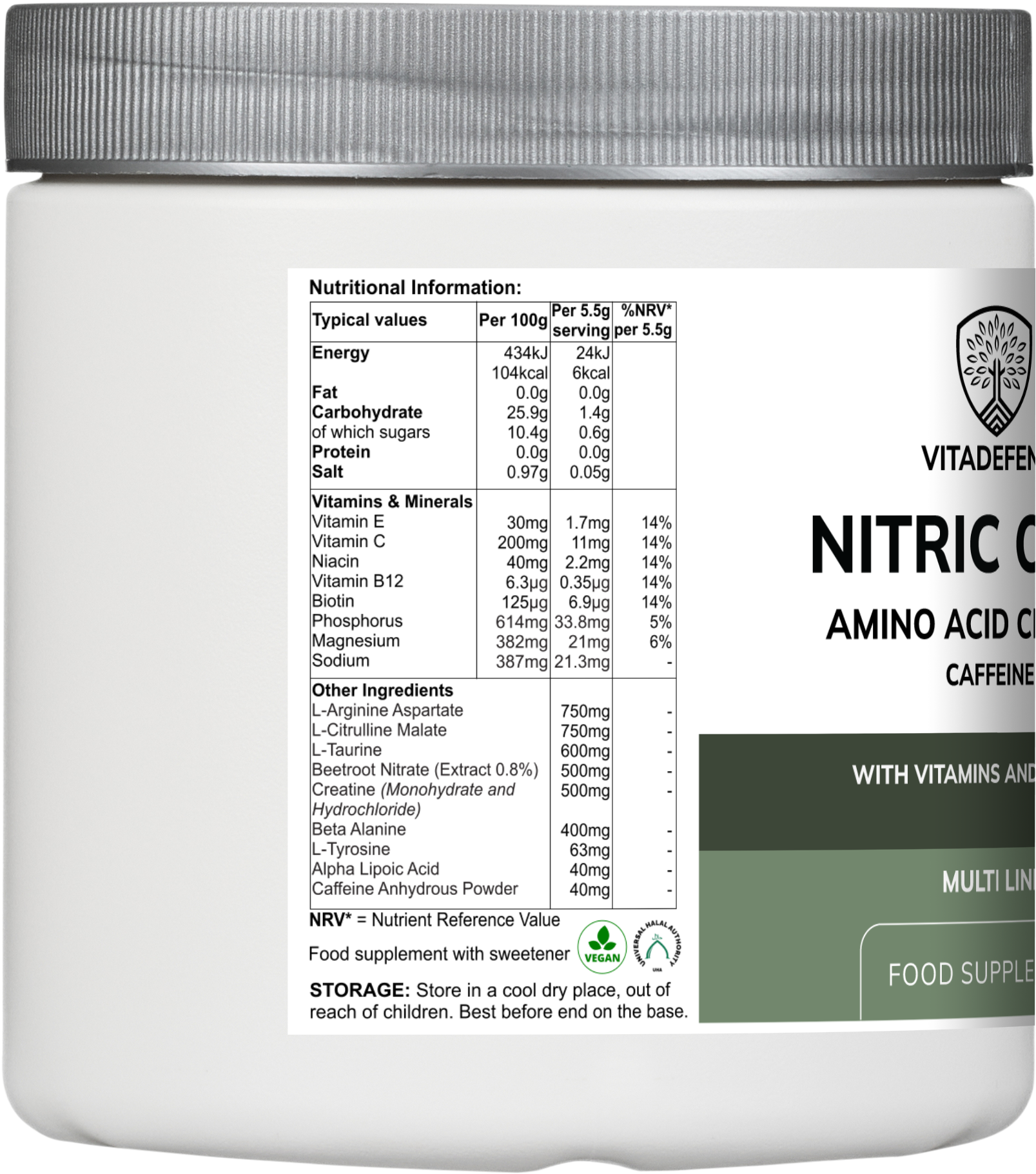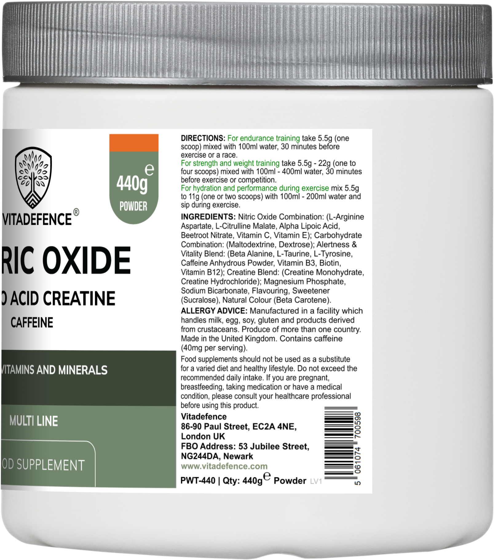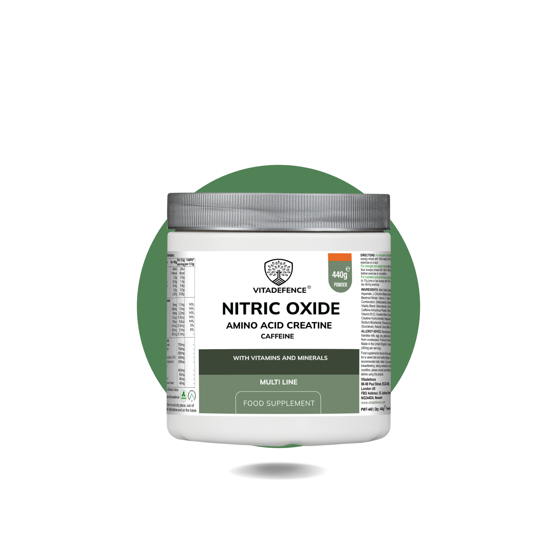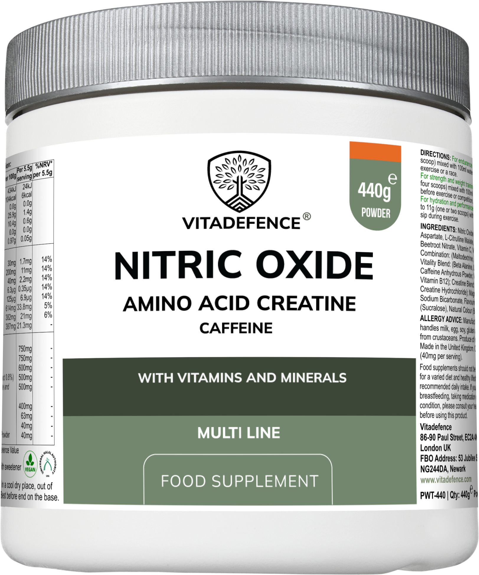 Vitadefence® Nitric Oxide Multi is a vegetarian capsule food supplement, manufactured in the UK to GMP standards. This formula combines amino acids L-arginine and L-citrulline with beetroot extract and supporting botanicals, in a convenient daily format.