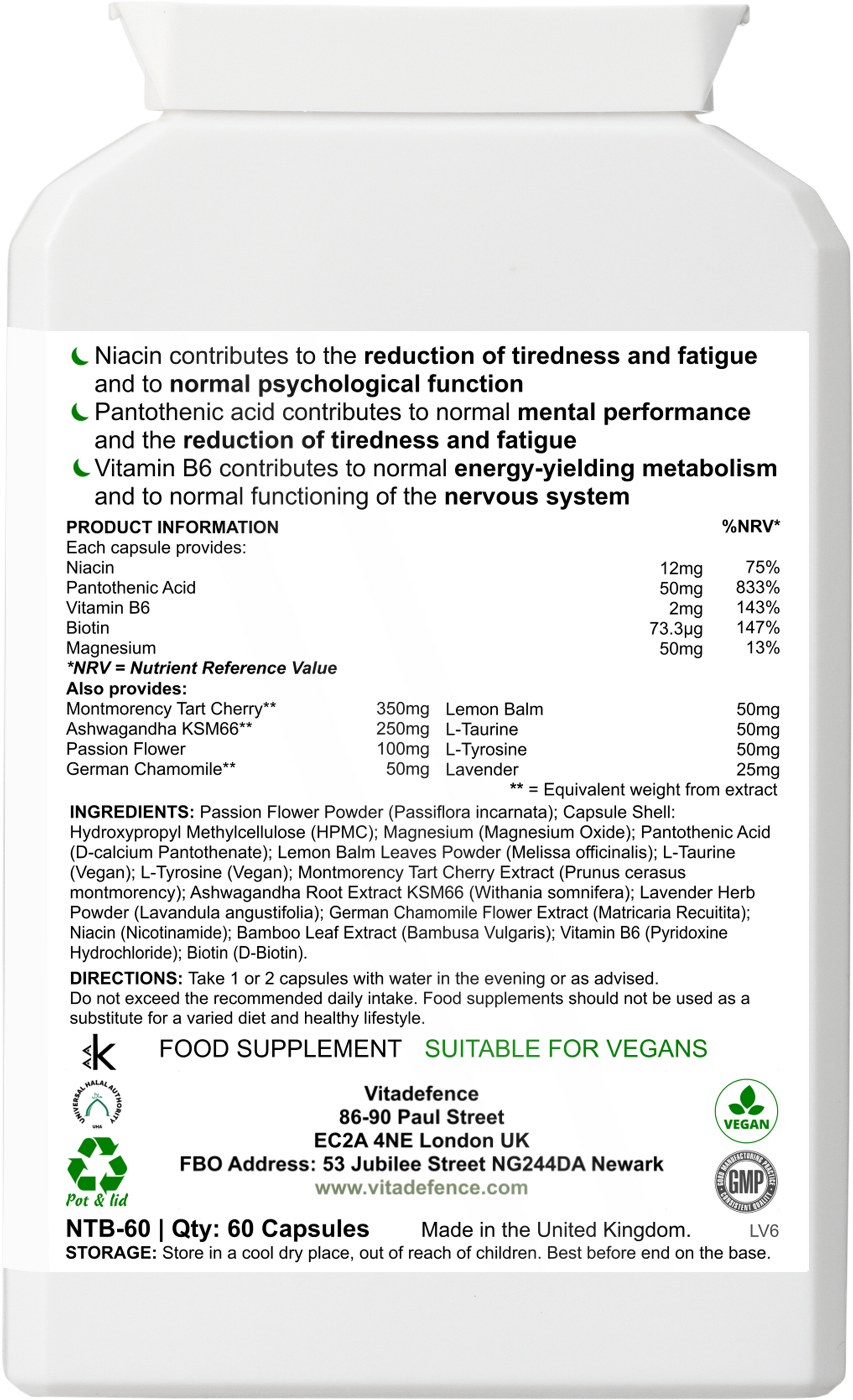 Vitadefence® Passion Flower Multi is a vegan capsule food supplement, manufactured in the UK to GMP standards. This balanced formula combines passion flower, Montmorency cherry, chamomile, ashwagandha KSM-66®, lemon balm, lavender, and L-tyrosine with key vitamins and minerals. Niacin contributes to the reduction of tiredness and fatigue and to normal psychological function. Pantothenic acid contributes to normal mental performance and to the reduction of tiredness and fatigue. Vitamin B6 contributes to normal energy-yielding metabolism and the normal functioning of the nervous system.