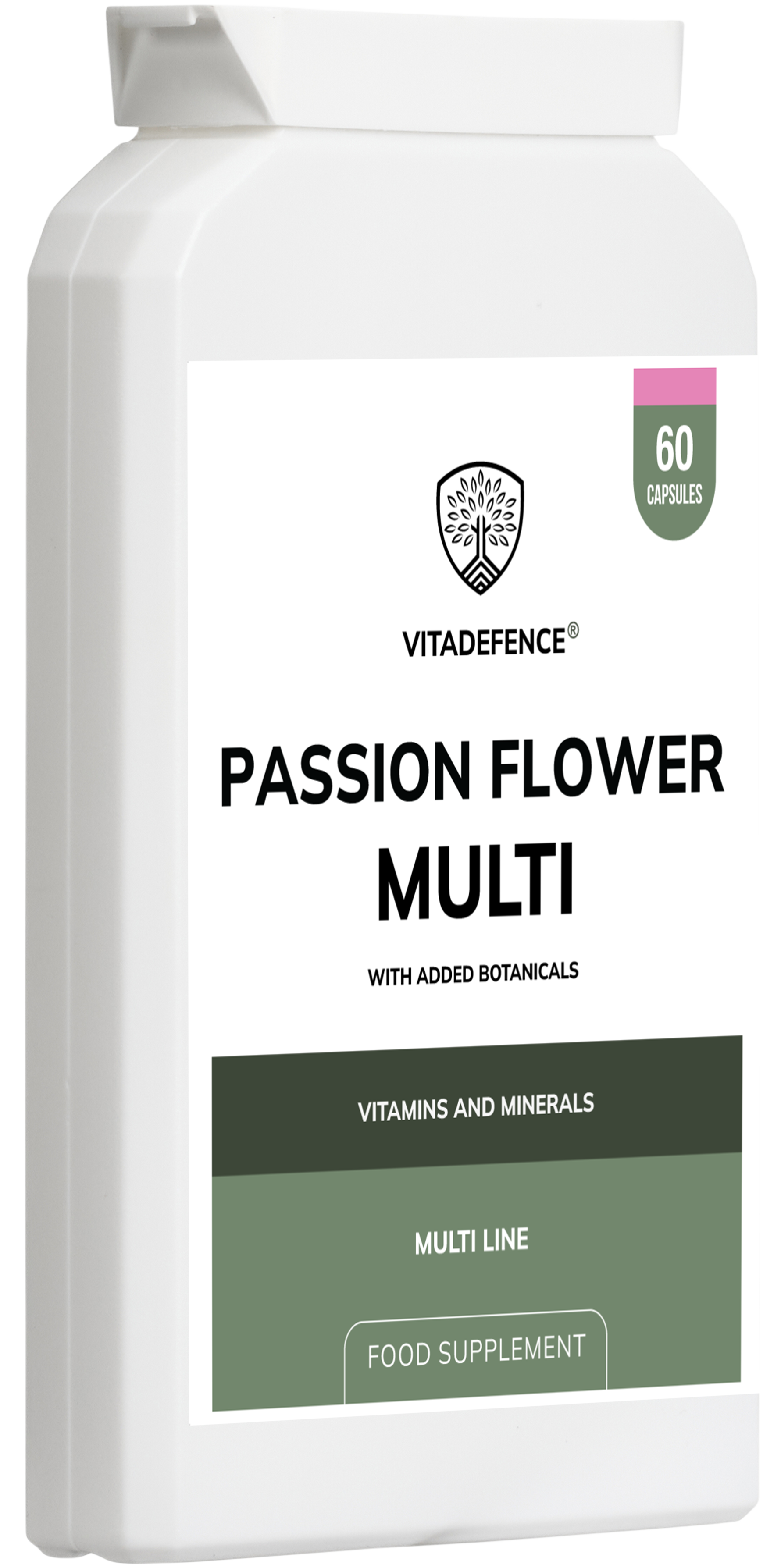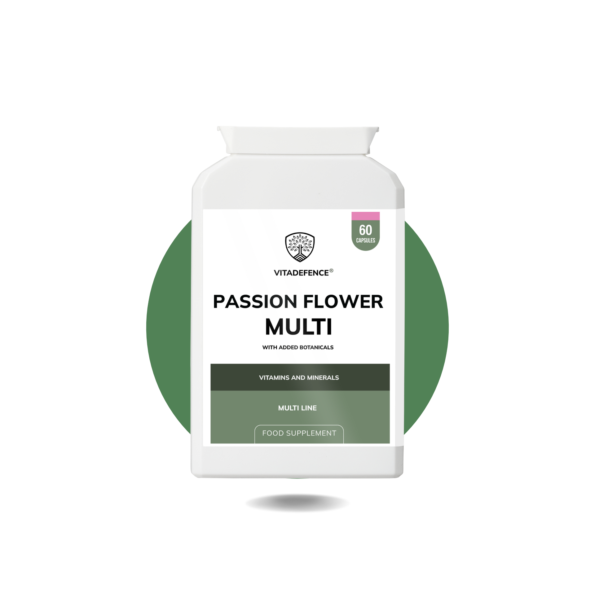 Vitadefence Passion Flower Multi combines passion flower, Montmorency cherry, chamomile, ashwagandha, lemon balm, lavender, and L-tyrosine.