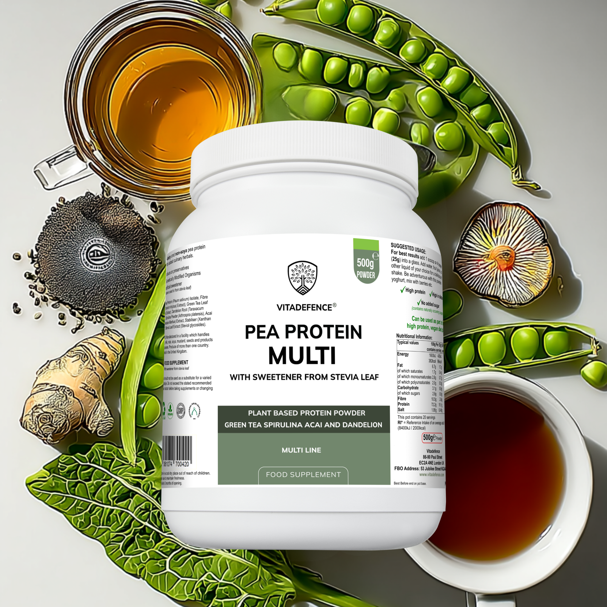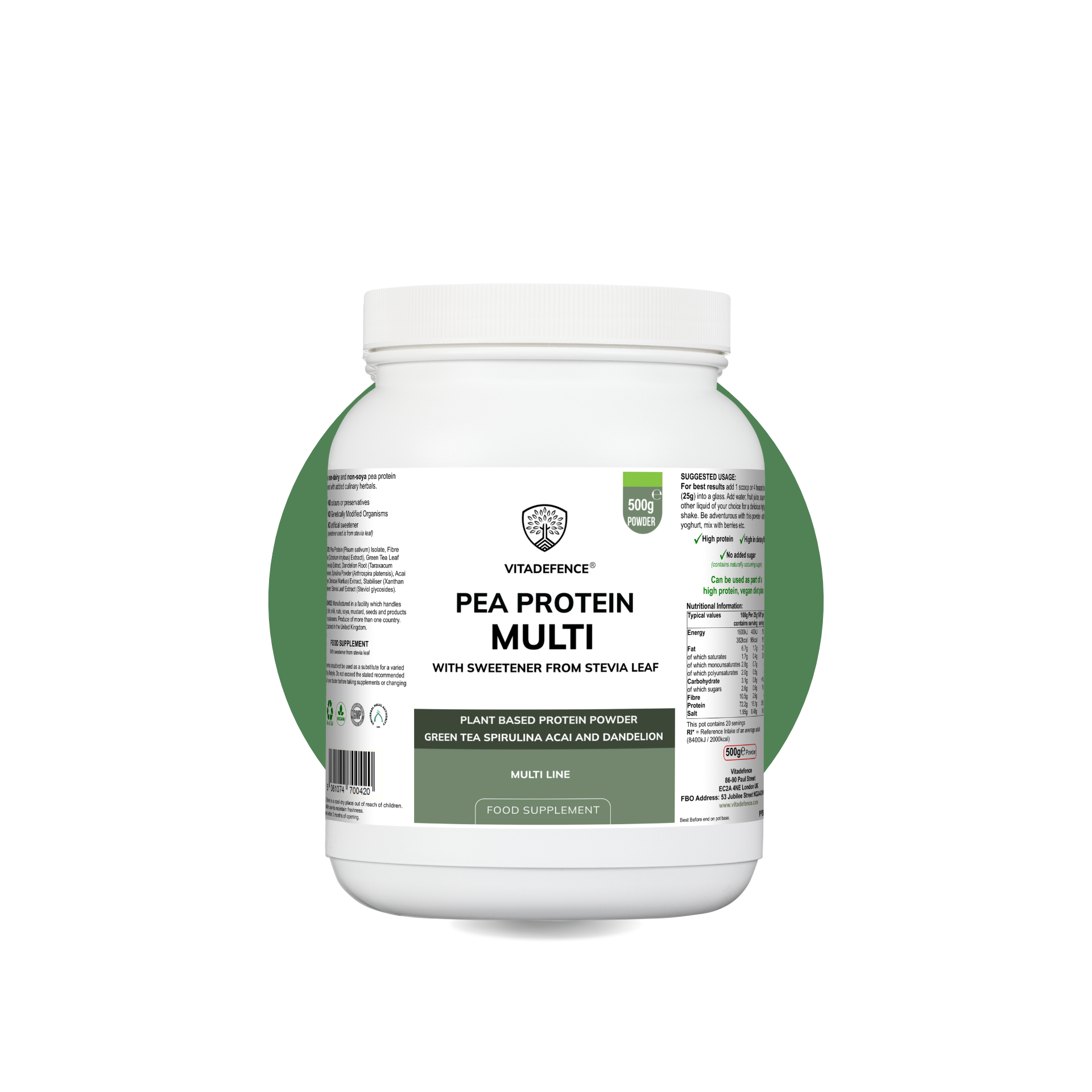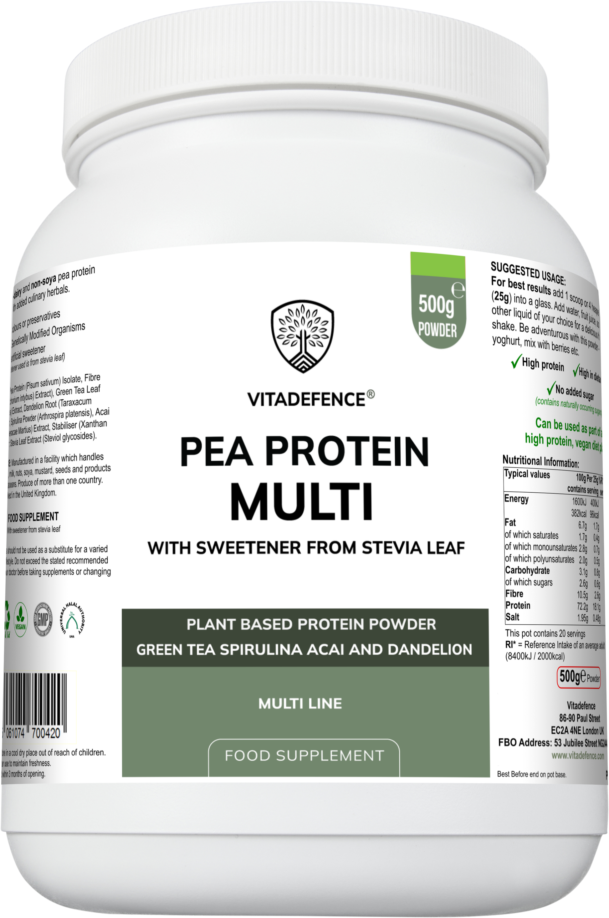 Vitadefence® Pea Protein Multi is a plant-based protein supplement, manufactured in the UK to GMP standards. Each serving provides high-quality pea protein isolate with added chicory root fibre, green tea, spirulina, açai berry, and dandelion root. Protein contributes to the growth and maintenance of muscle mass and the maintenance of normal bones. This formula is naturally sweetened with stevia leaf extract, containing no artificial sweeteners, no preservatives, no GMOs, and no added sugar (only naturally occurring sugars).