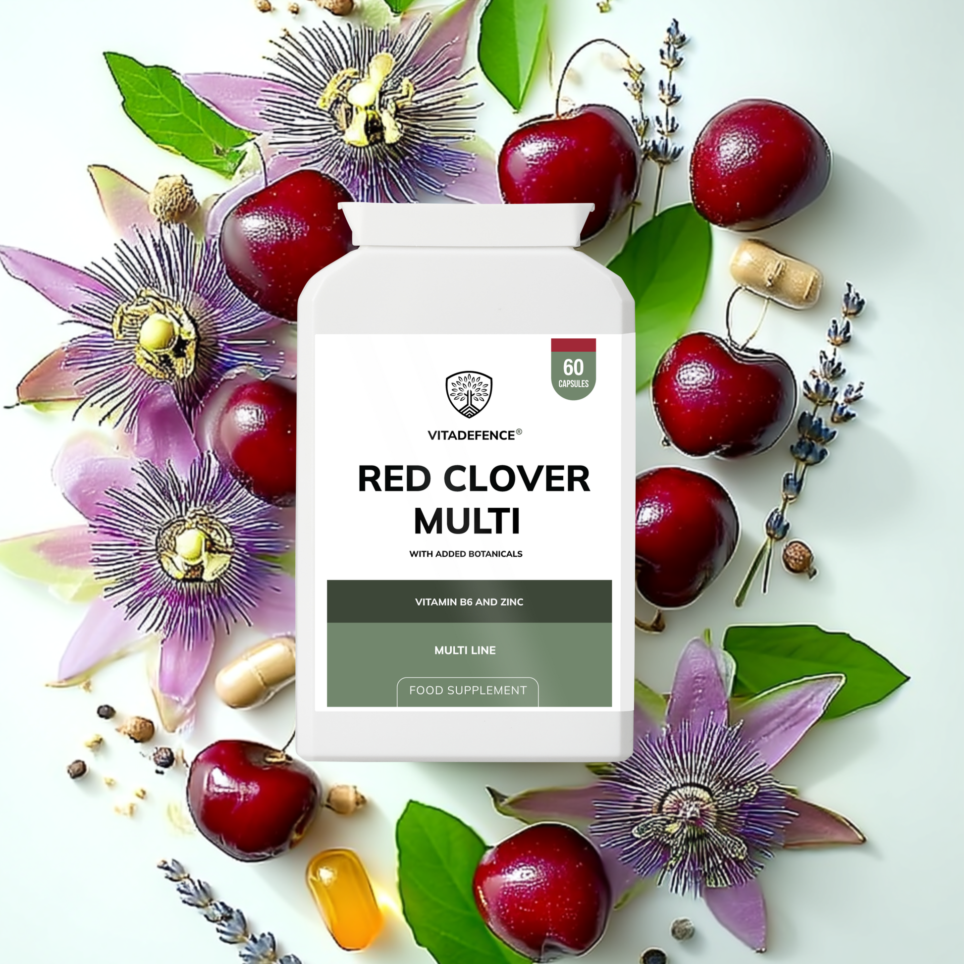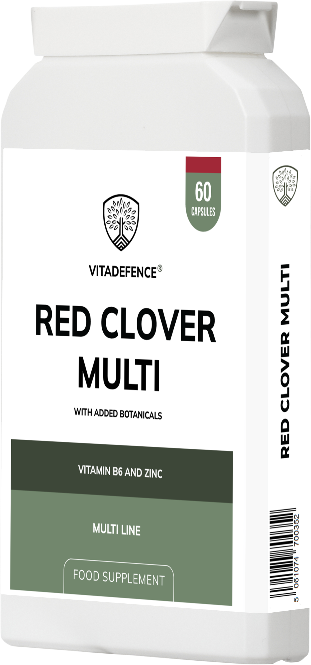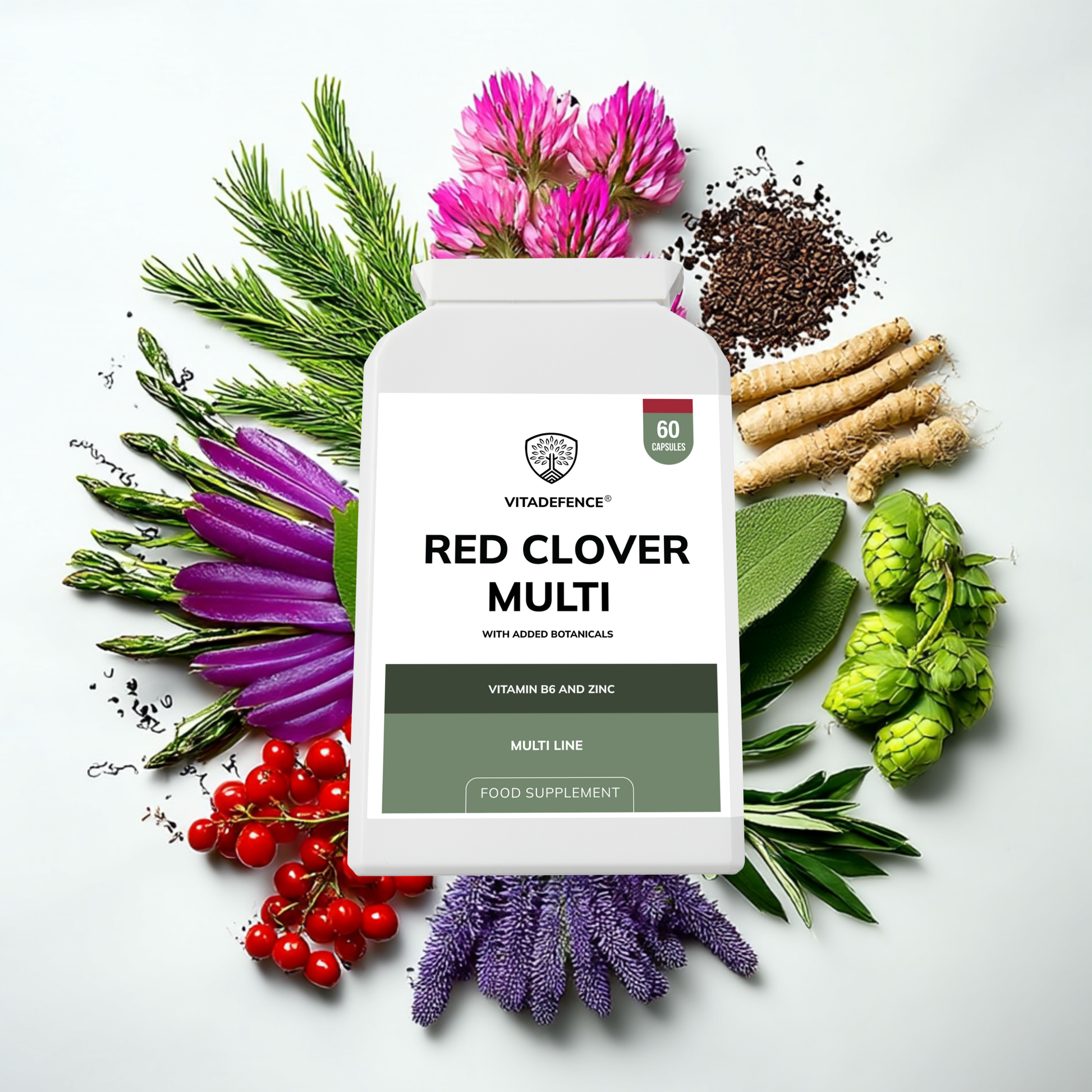 Vitadefence Red Clover Multi combines red clover, wild yam, bamboo, sage leaf, and schizandra berry with vitamin B6 and zinc.