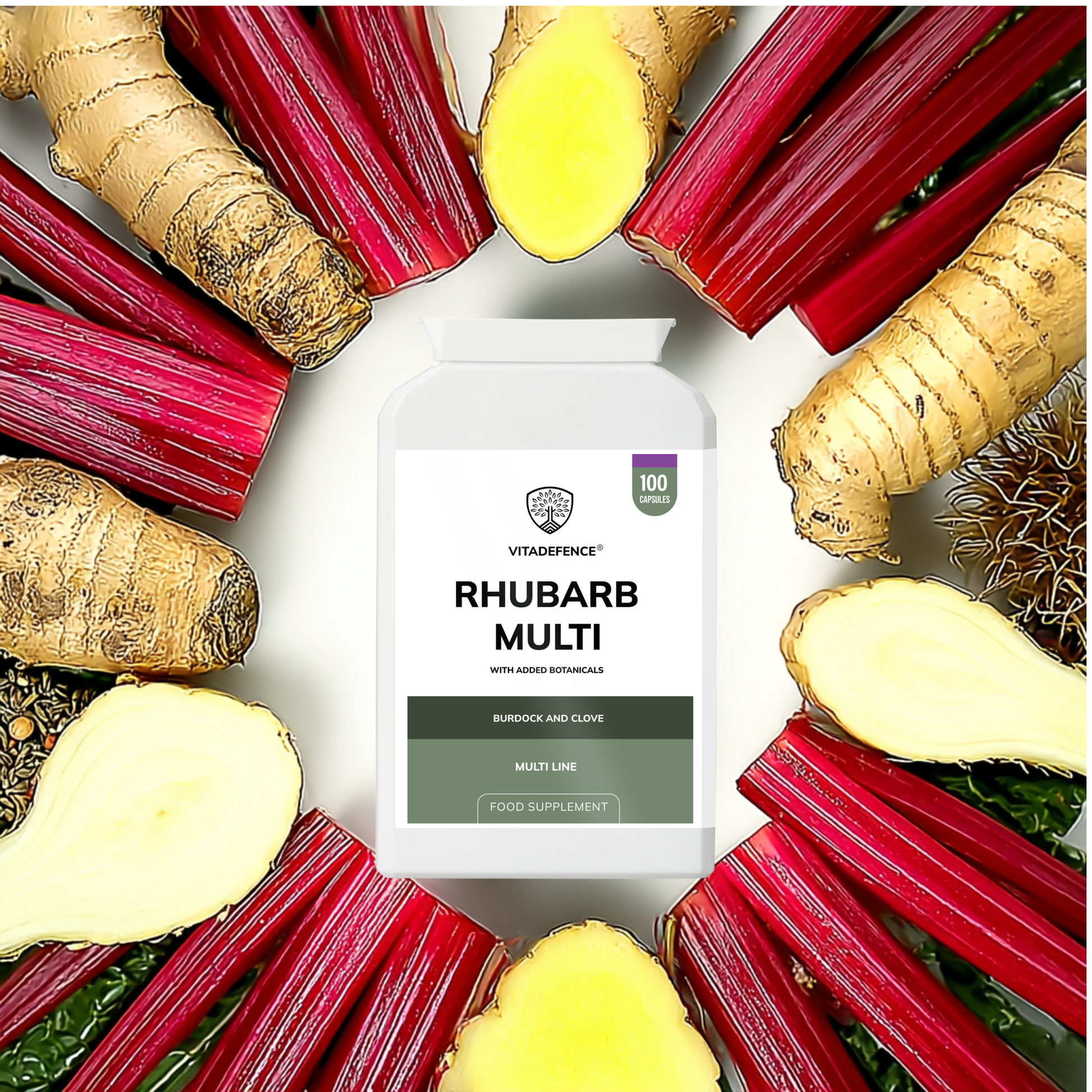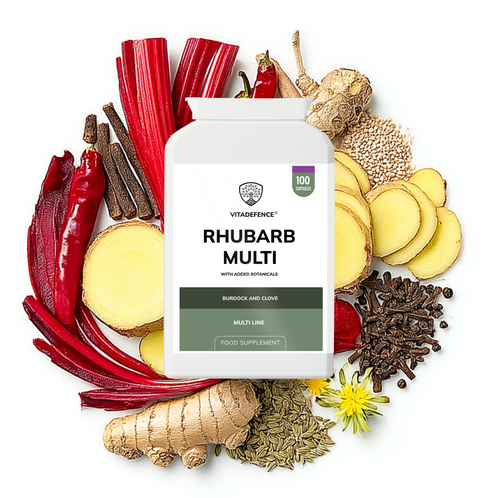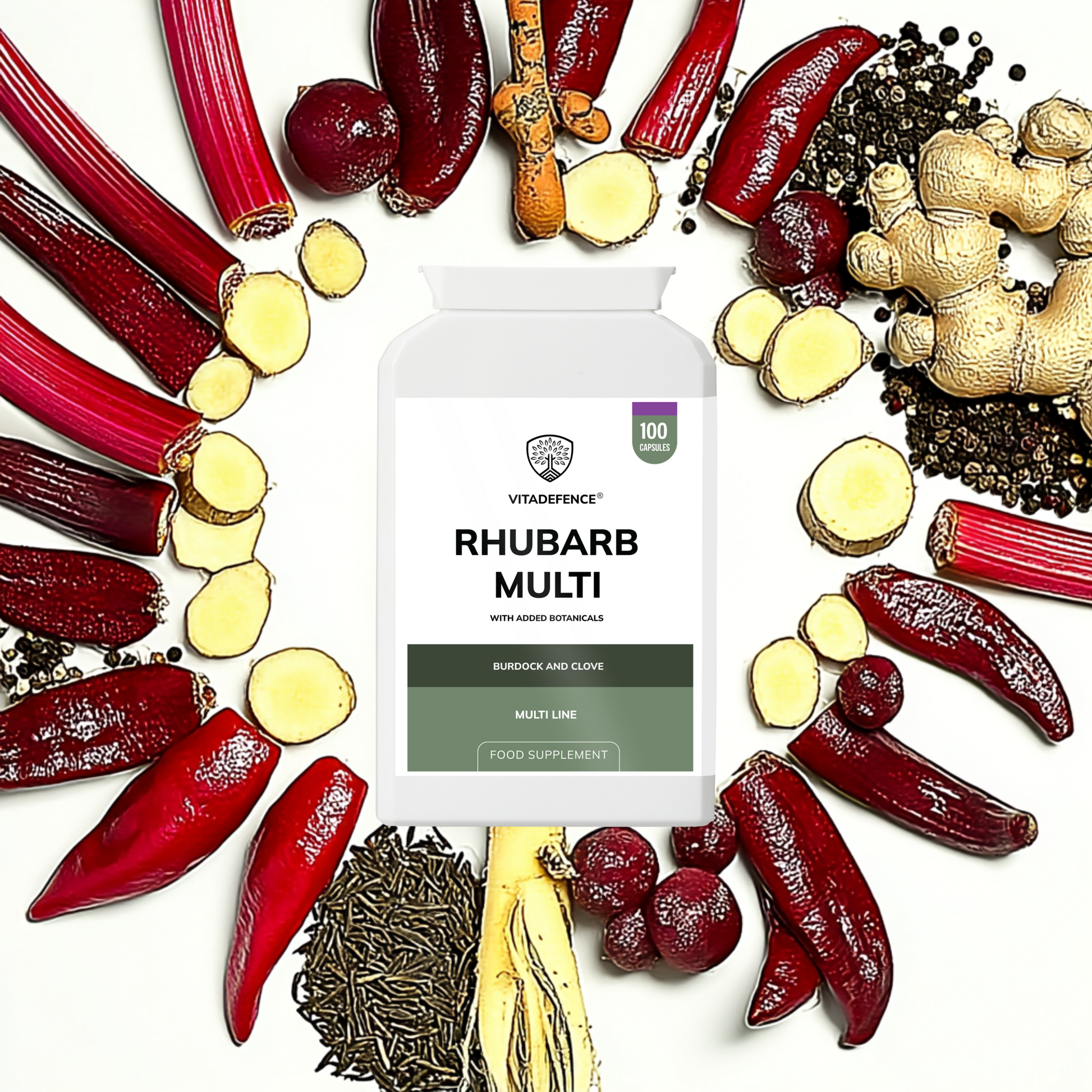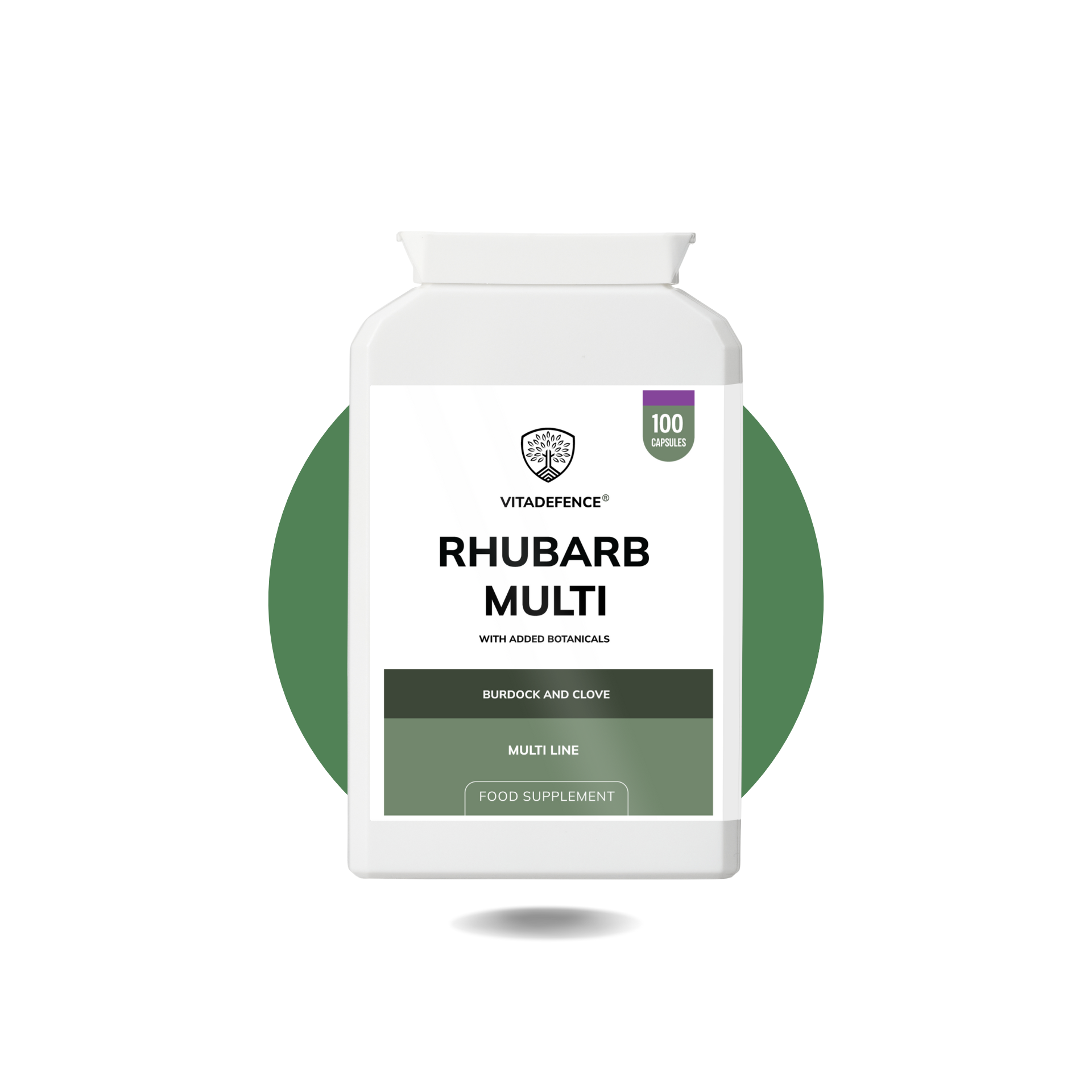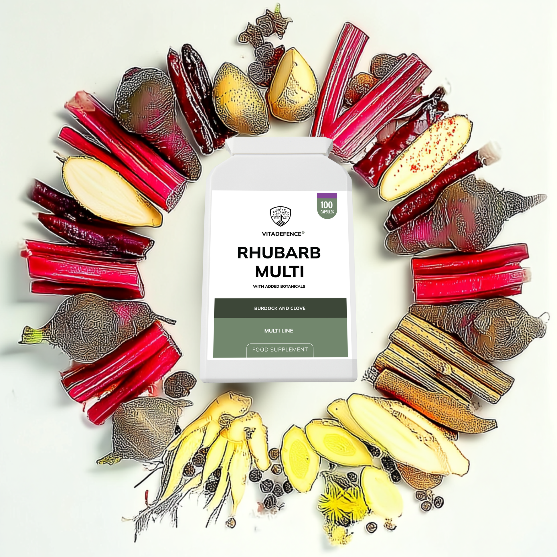 Vitadefence Rhubarb Multi provides a high-fibre botanical blend with rhubarb, burdock, ginger, fennel seed, clove bud, cayenne, barberry bark, and dandelion root.