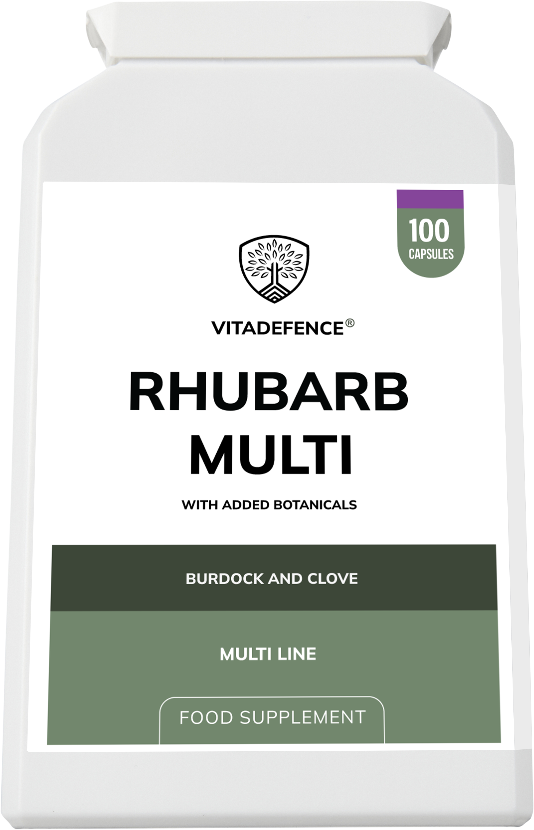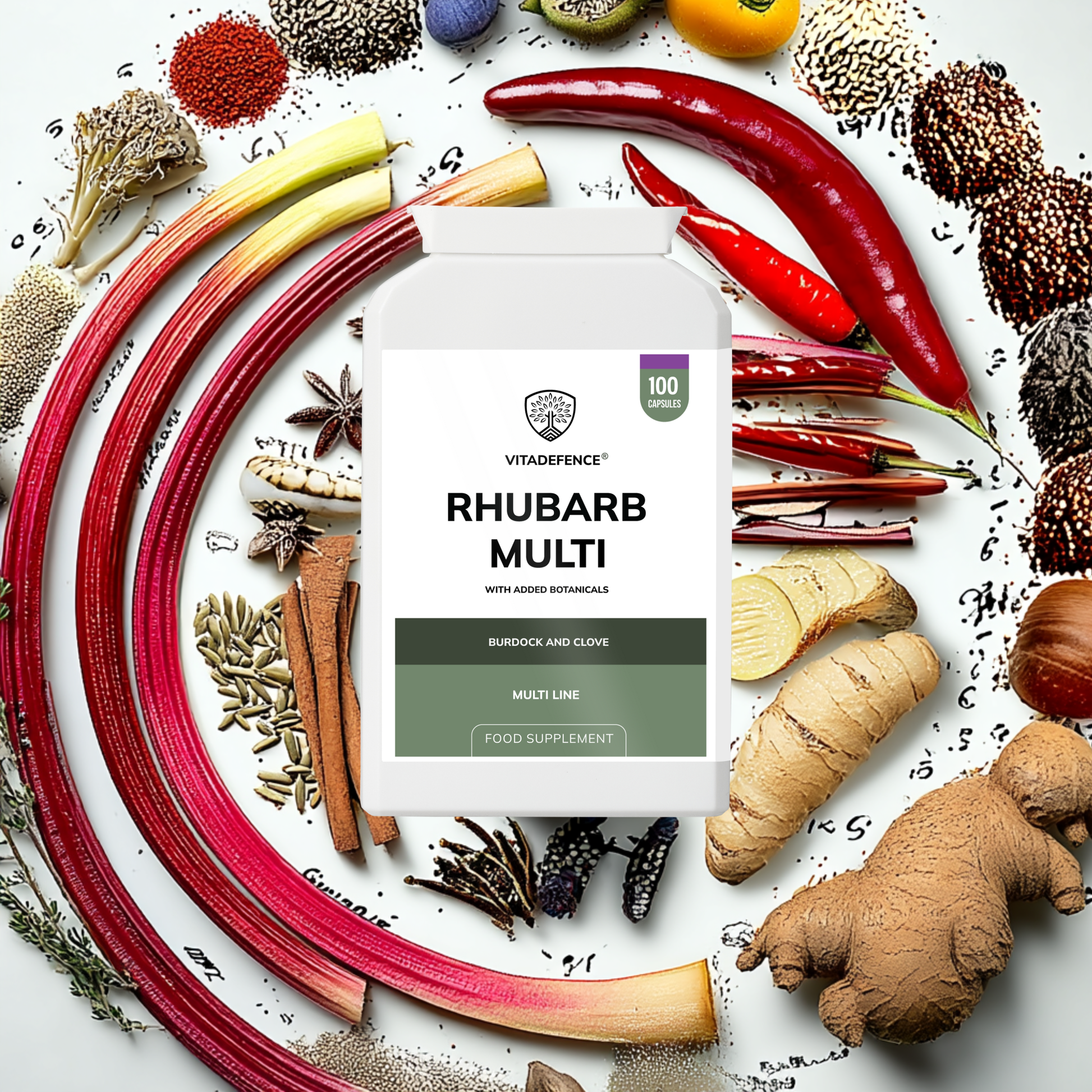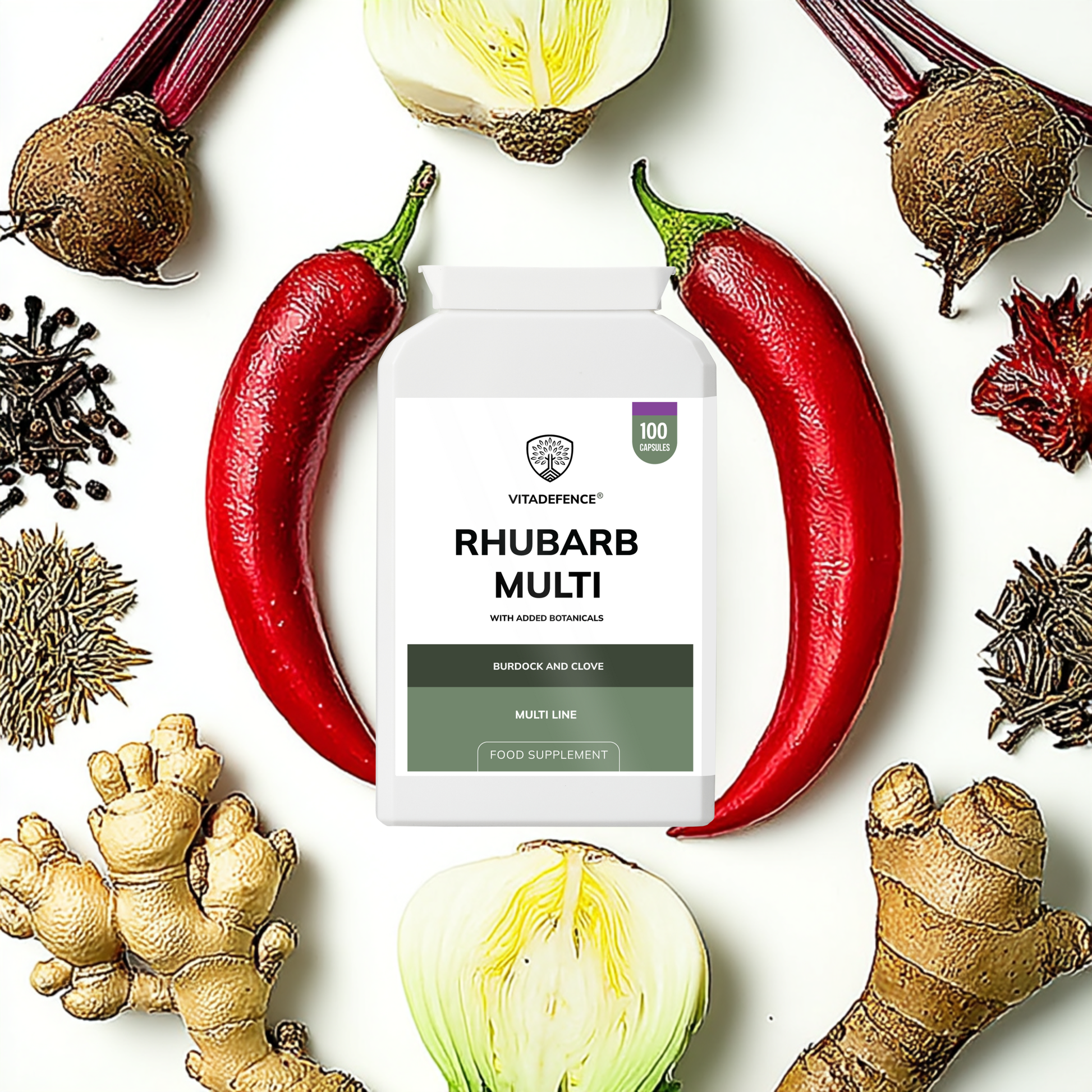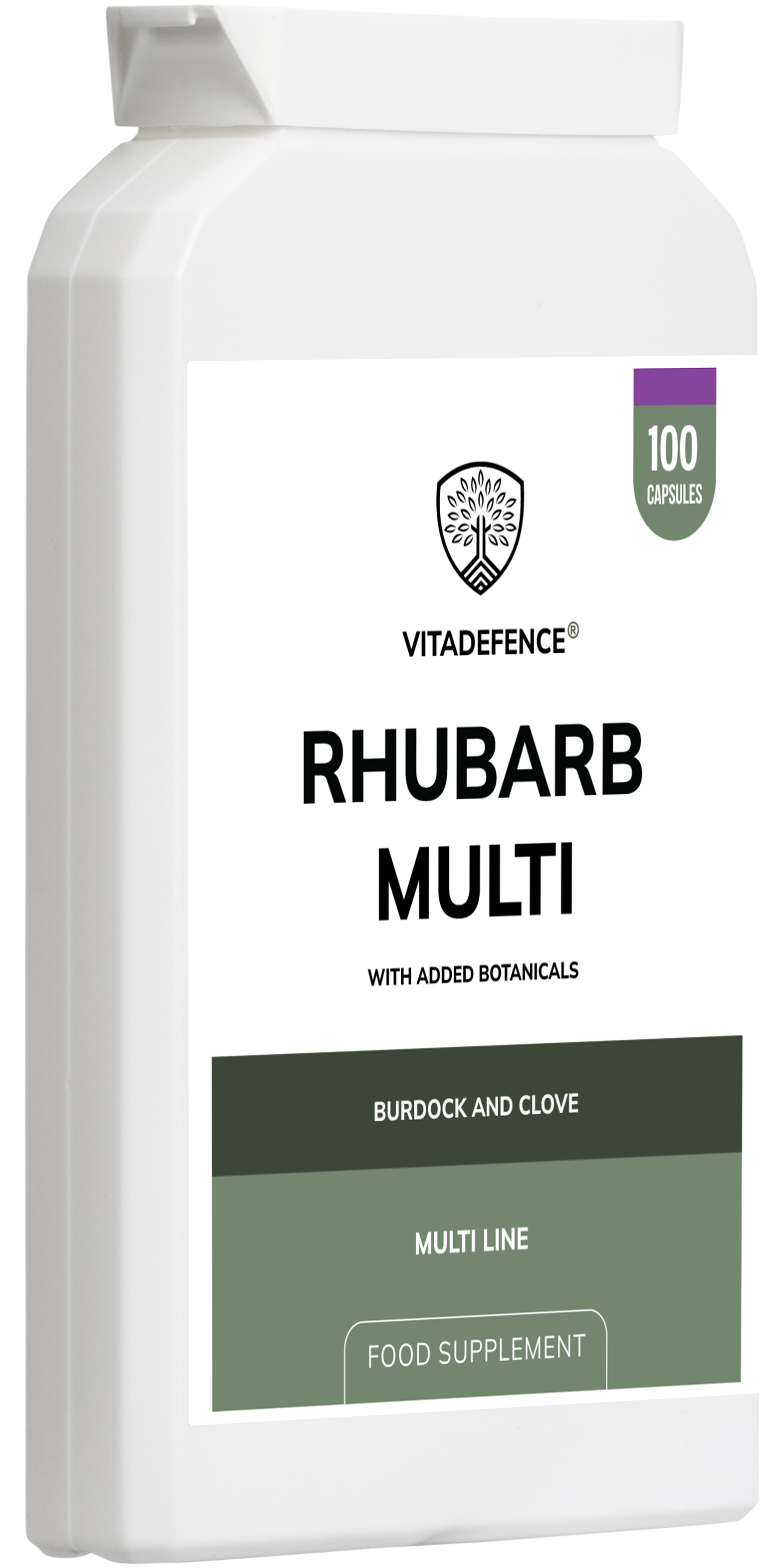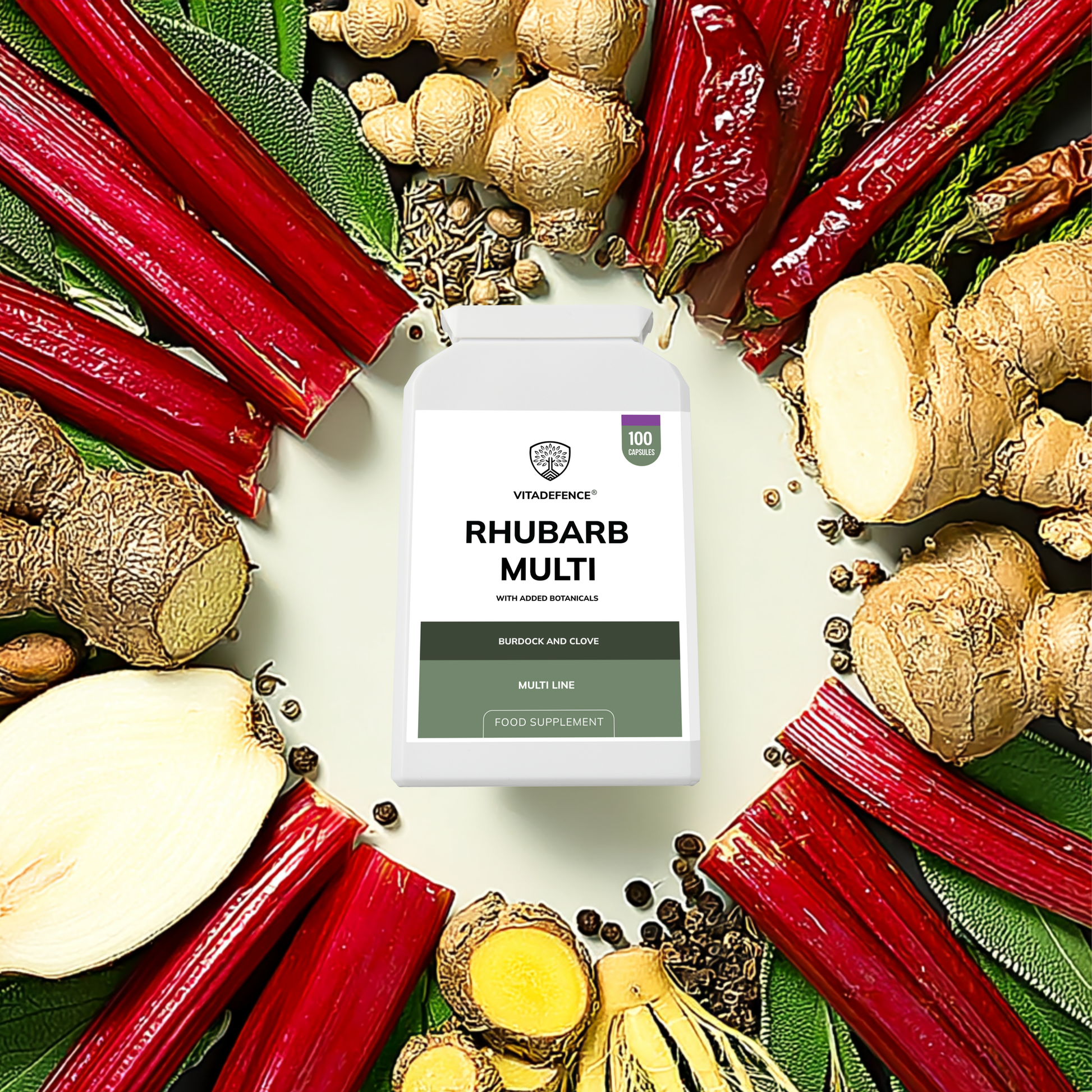 Vitadefence Rhubarb Multi provides a high-fibre botanical blend with rhubarb, burdock, ginger, fennel seed, clove bud, cayenne, barberry bark, and dandelion root.