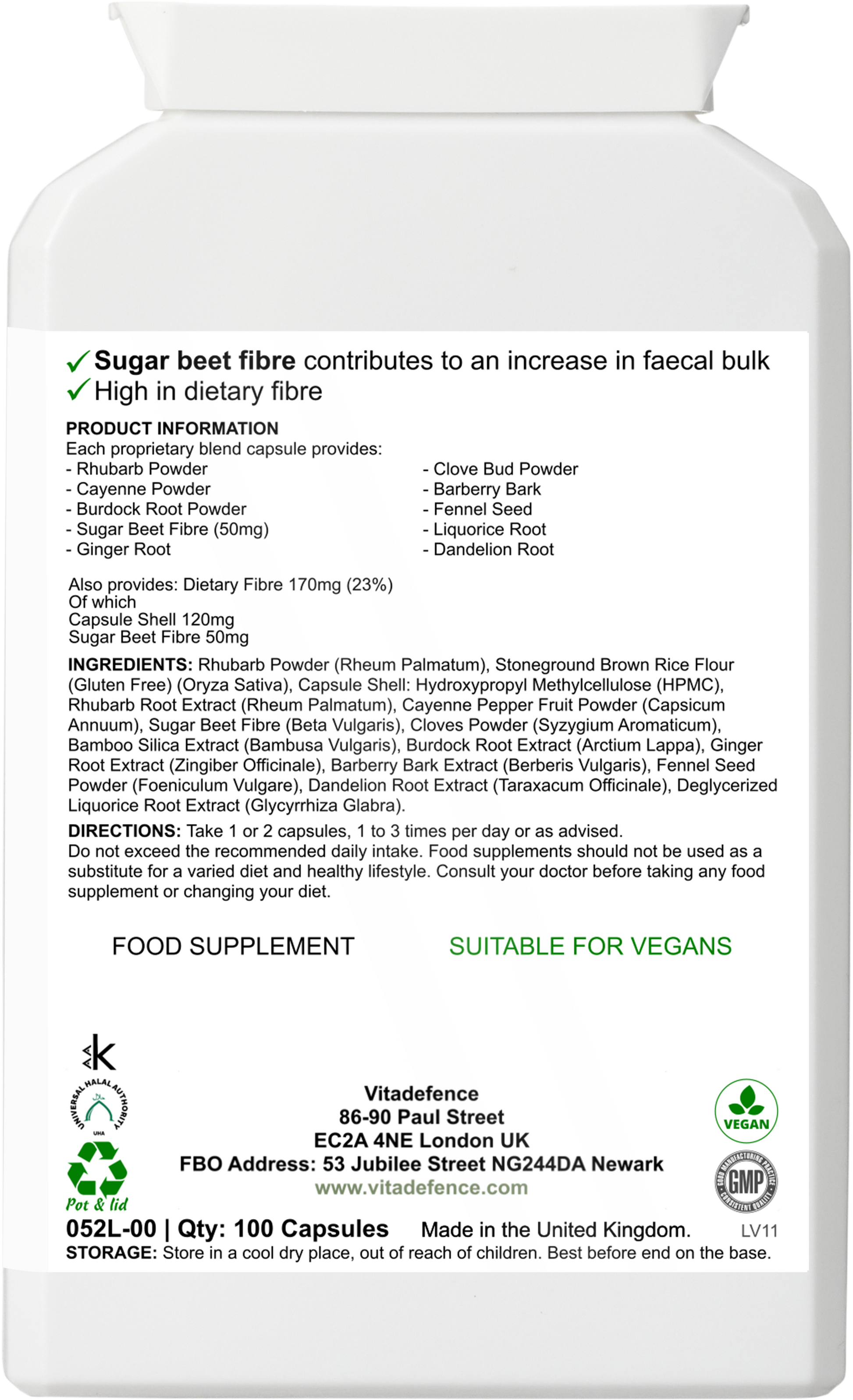 Vitadefence® Rhubarb Multi is a vegan capsule food supplement, manufactured in the UK to GMP standards. This high-fibre blend combines rhubarb, burdock, ginger, fennel seed, clove bud, cayenne, barberry bark, dandelion root, and sugar beet fibre. Sugar beet fibre contributes to an increase in faecal bulk and supports normal bowel function. Each serving provides 170 mg of dietary fibre.