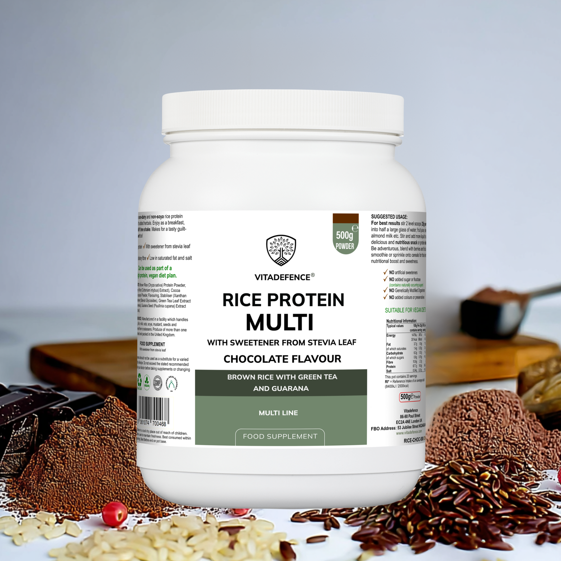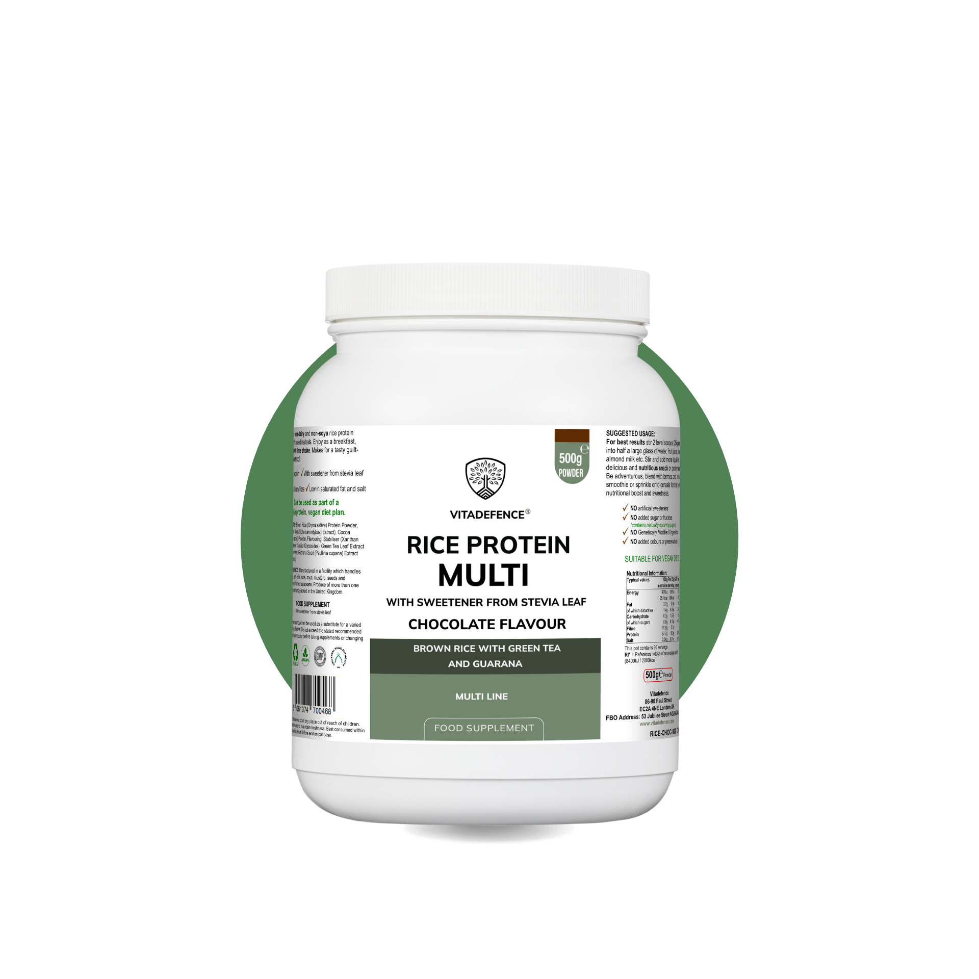 Vitadefence® Rice Protein Multi is a vegan protein supplement, manufactured in the UK to GMP standards. Each 25 g serving provides 20 g of protein from brown rice protein, blended with green tea and guarana, and sweetened with stevia leaf. Protein contributes to the growth and maintenance of muscle mass and the maintenance of normal bones. This formula is high in protein and fibre, low in saturated fat and salt, and made without artificial sweeteners, added sugar, fructose, colours, preservatives, or genetically modified ingredients.