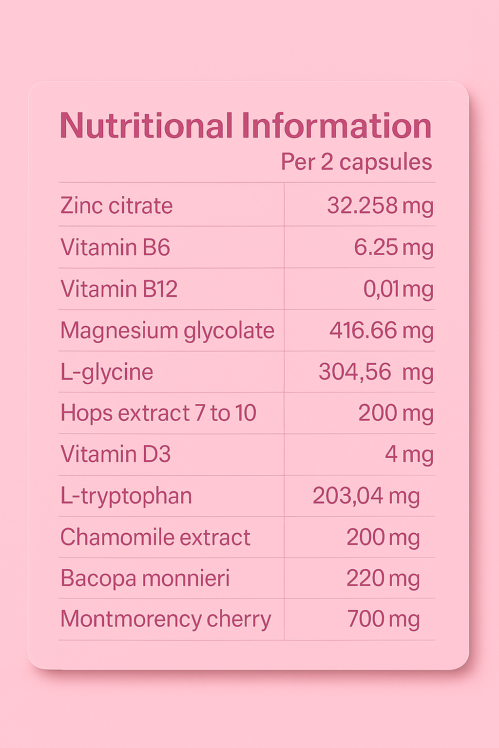 Zinc Citrate, Magnesium Glycinate, L-Glycine, Hops Extract, Vitamin D3, L-Tryptophan, Chamomile Extract, Bacopa Monnieri, Montmorency Cherry, Vitamin B6, Vitamin B12, Capsule Shell (Vegetable Cellulose).