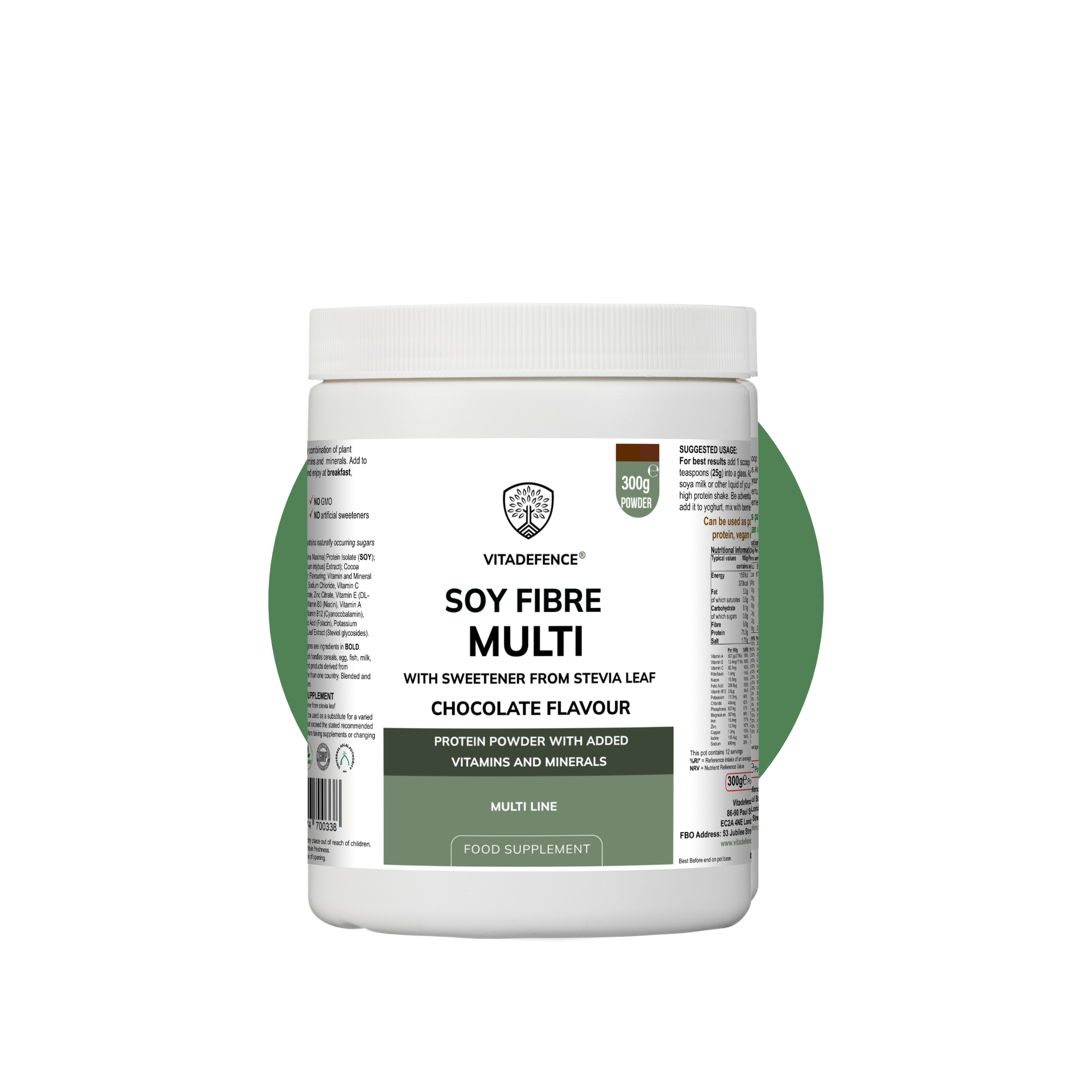 Vitadefence® Soy Fibre Multi is a plant-based protein supplement, manufactured in the UK to GMP standards. Each serving provides high-quality soy protein isolate, naturally high in protein and fibre, with no added sugar and no artificial flavours or sweeteners. The formula is enriched with essential vitamins and minerals, including vitamins A, C, D, E, B-complex, magnesium, zinc, calcium, iron, and potassium. Protein contributes to the growth and maintenance of muscle mass and the maintenance of normal bones. Vitamin C contributes to the normal function of the immune system, while iron contributes to the reduction of tiredness and fatigue and normal energy-yielding metabolism.