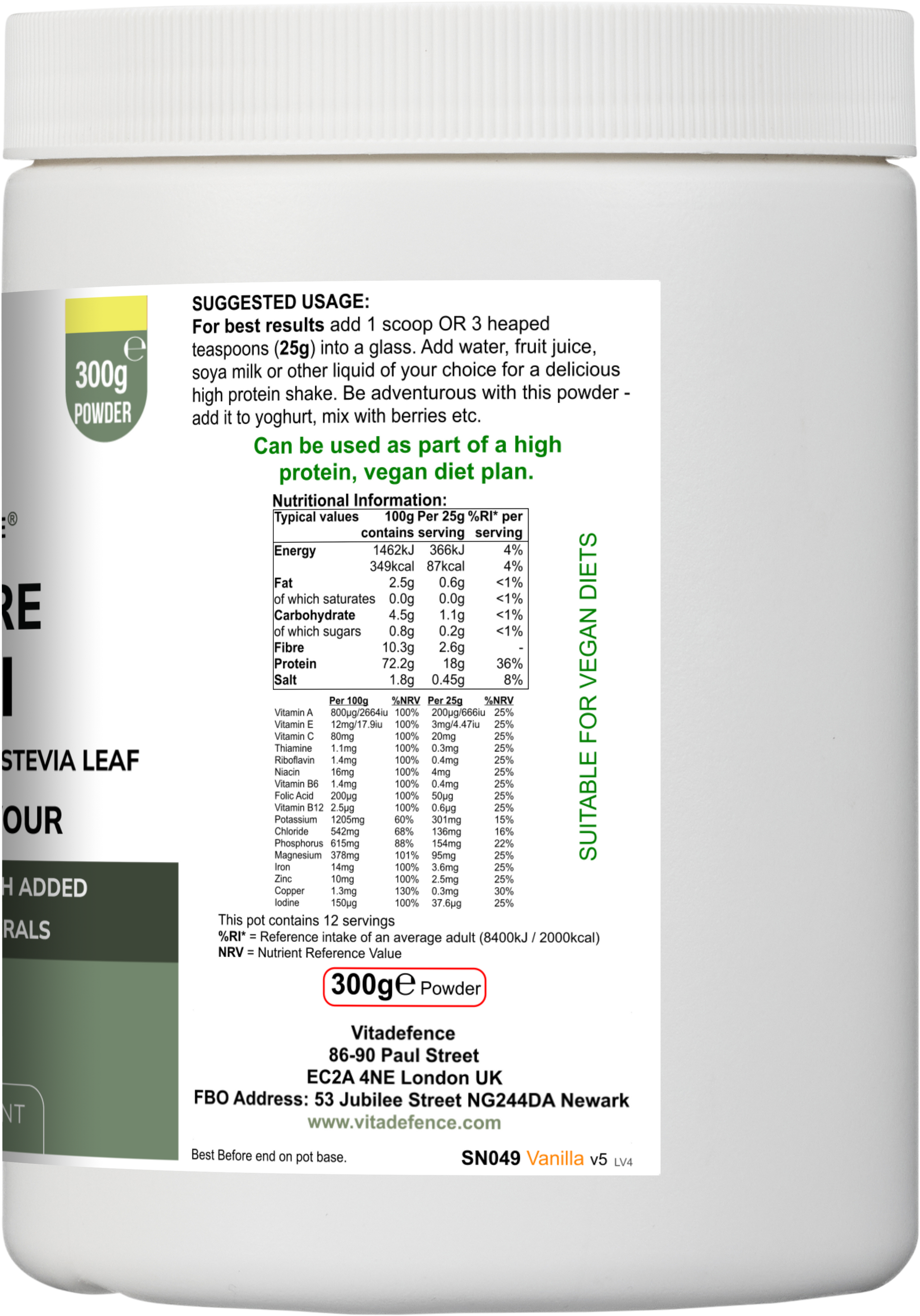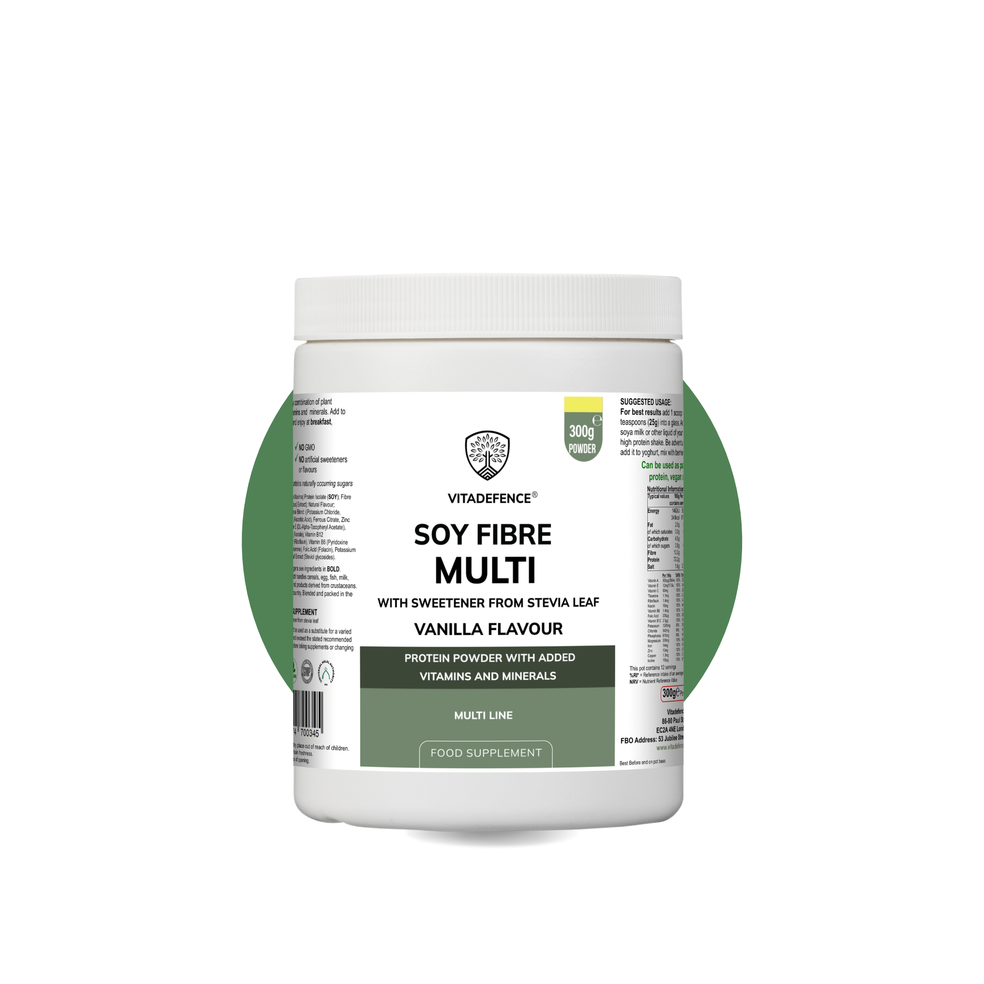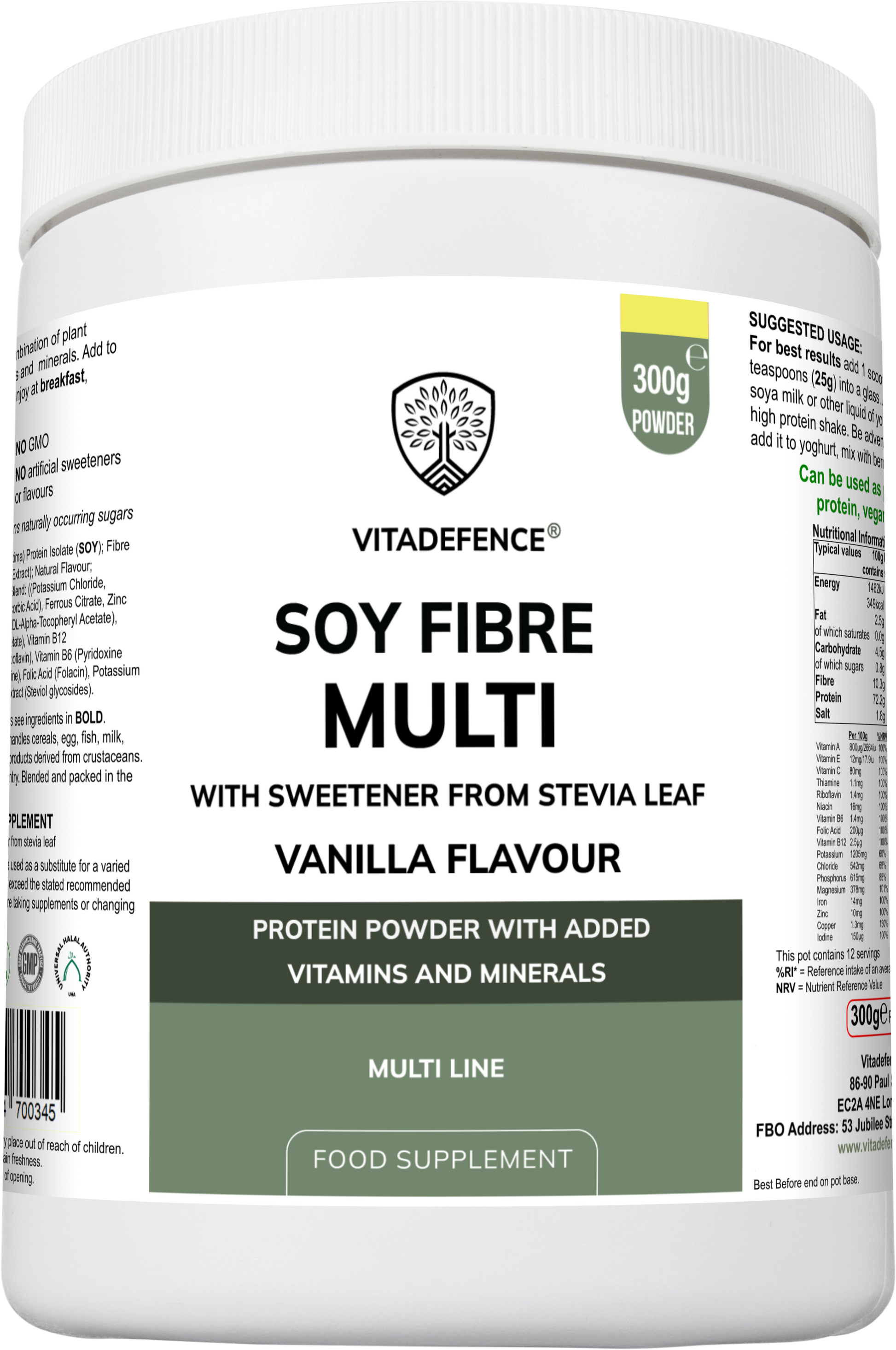 Vitadefence® Soy Fibre Multi is a plant-based protein supplement, manufactured in the UK to GMP standards. Each serving provides high-quality soy protein isolate, naturally high in protein and fibre, with no added sugar and no artificial flavours or sweeteners. The formula is enriched with essential vitamins and minerals, including vitamins A, C, D, E, B-complex, magnesium, zinc, calcium, iron, and potassium. Protein contributes to the growth and maintenance of muscle mass and the maintenance of normal bones. Vitamin C contributes to the normal function of the immune system, while iron contributes to the reduction of tiredness and fatigue and normal energy-yielding metabolism.