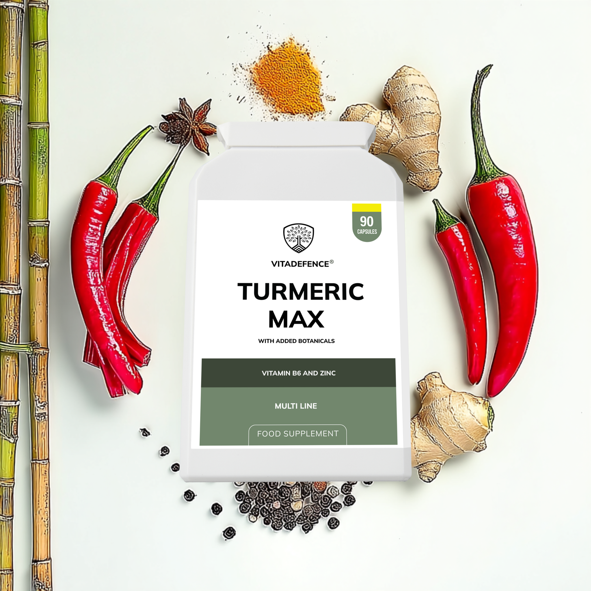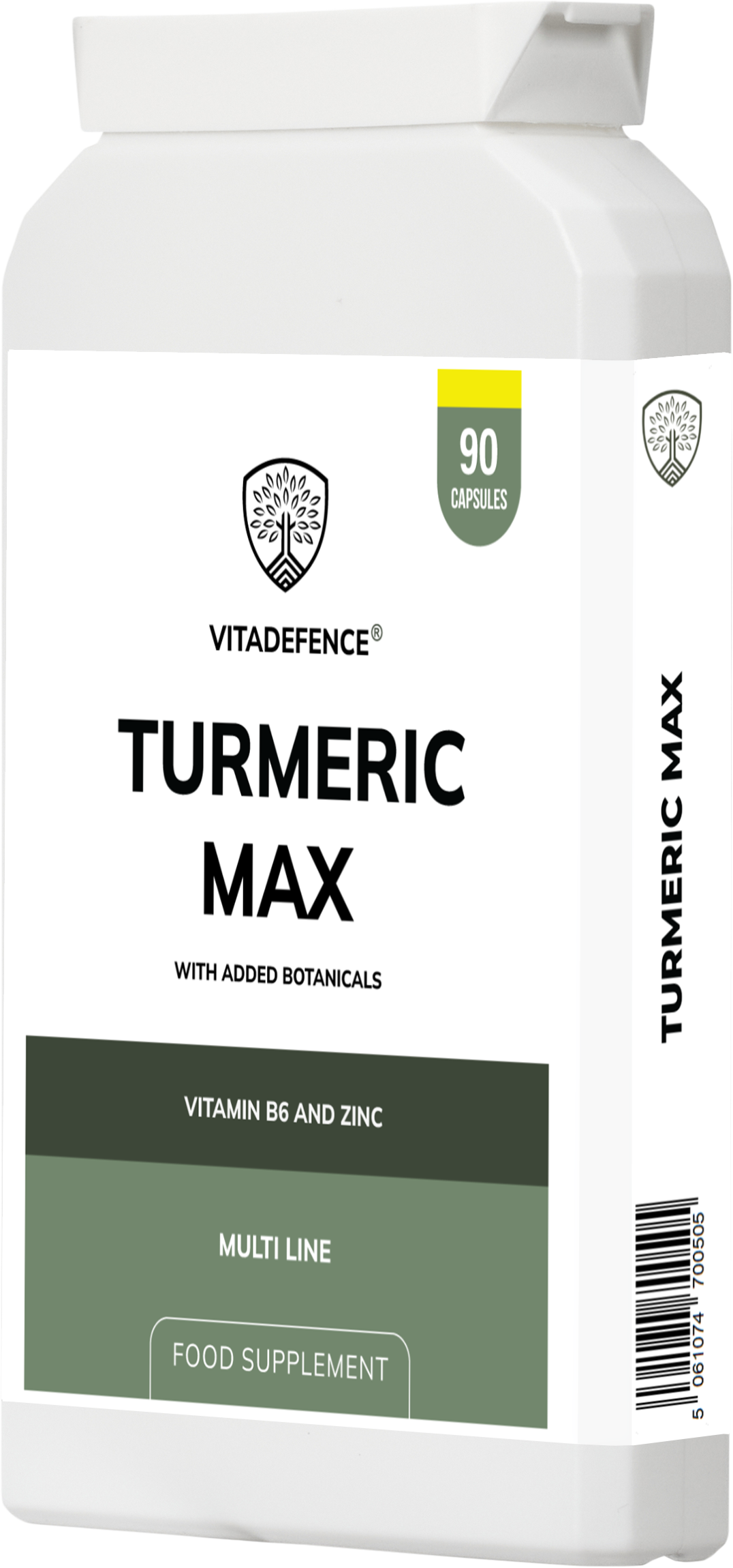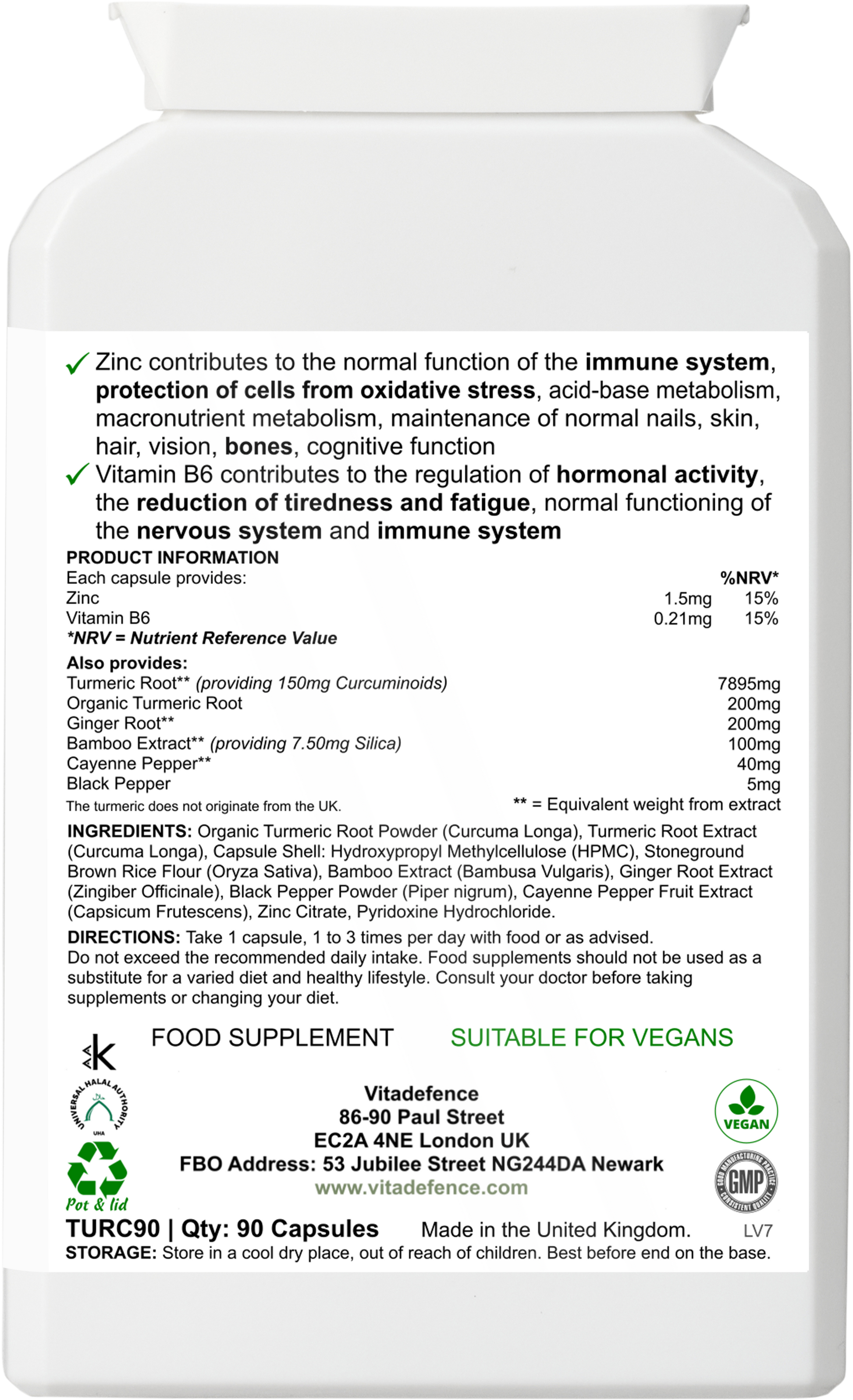 Vitadefence® Turmeric Max is a vegan capsule food supplement, manufactured in the UK to GMP standards. This advanced botanical formula combines organic turmeric root and extract with ginger, cayenne, and bamboo, together with vitamin B6 and zinc. Zinc contributes to the normal function of the immune system, the protection of cells from oxidative stress, acid-base metabolism, macronutrient metabolism, and the maintenance of normal nails, skin, hair, vision, bones, and cognitive function. Vitamin B6 contributes to the regulation of hormonal activity, the reduction of tiredness and fatigue, and the normal functioning of the nervous and immune systems.