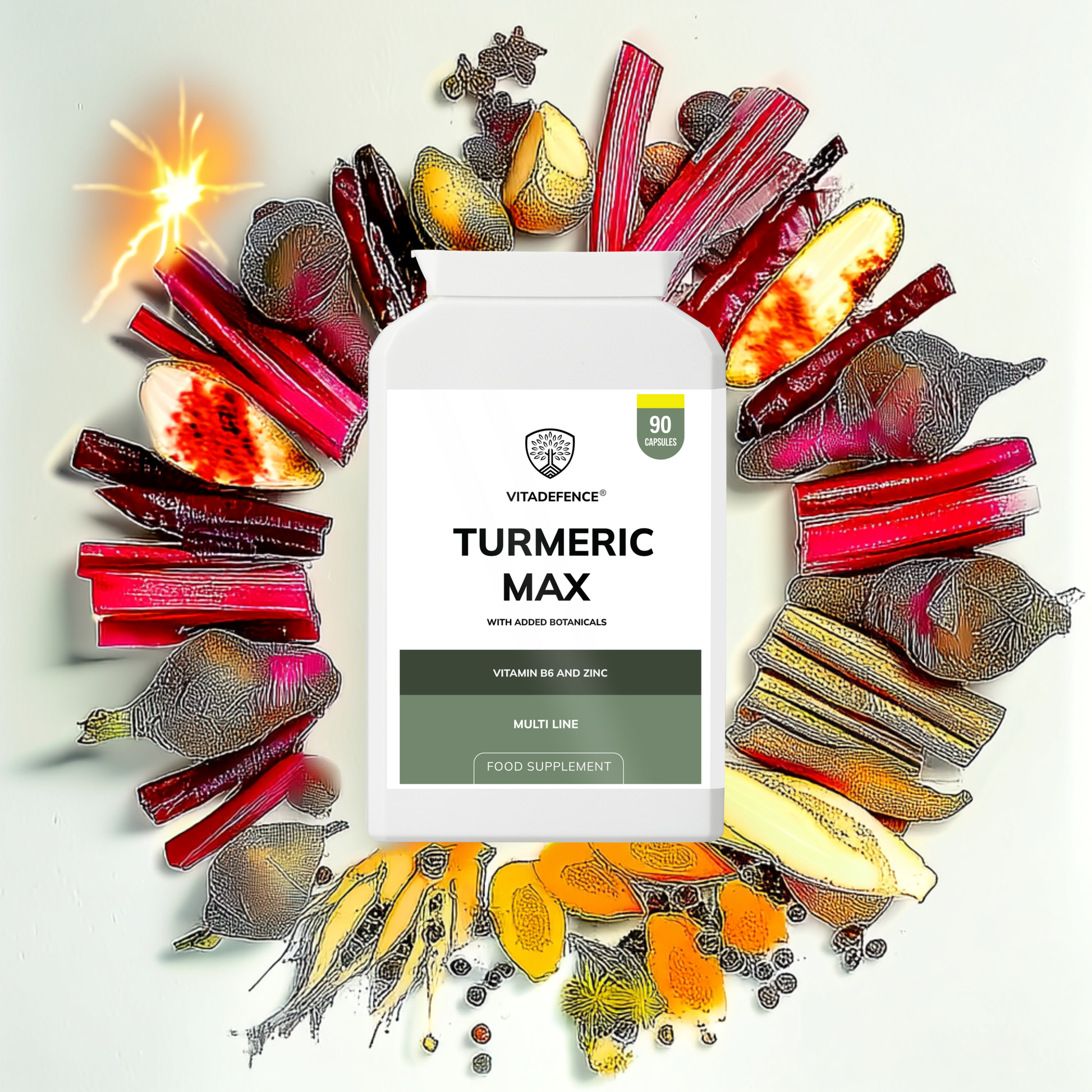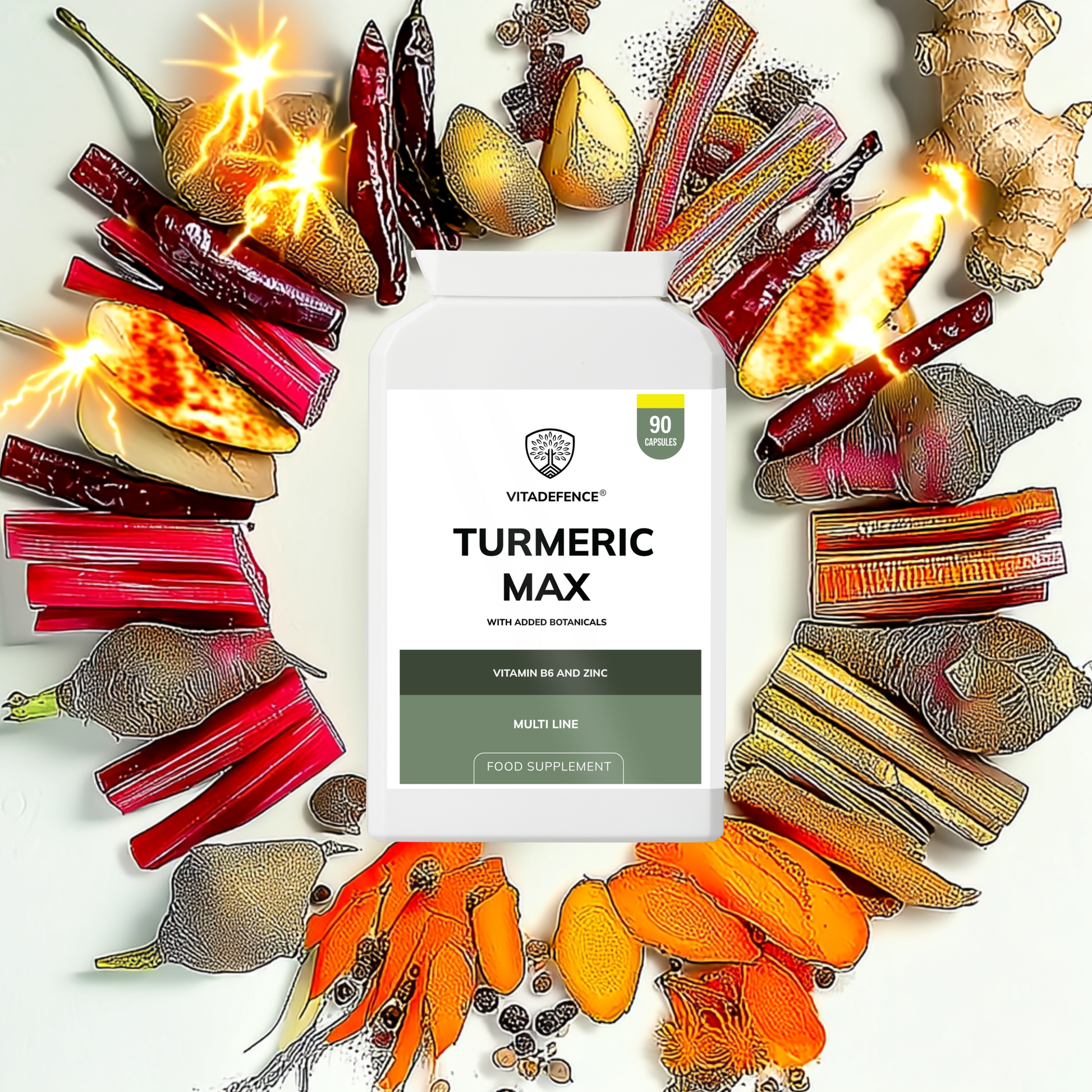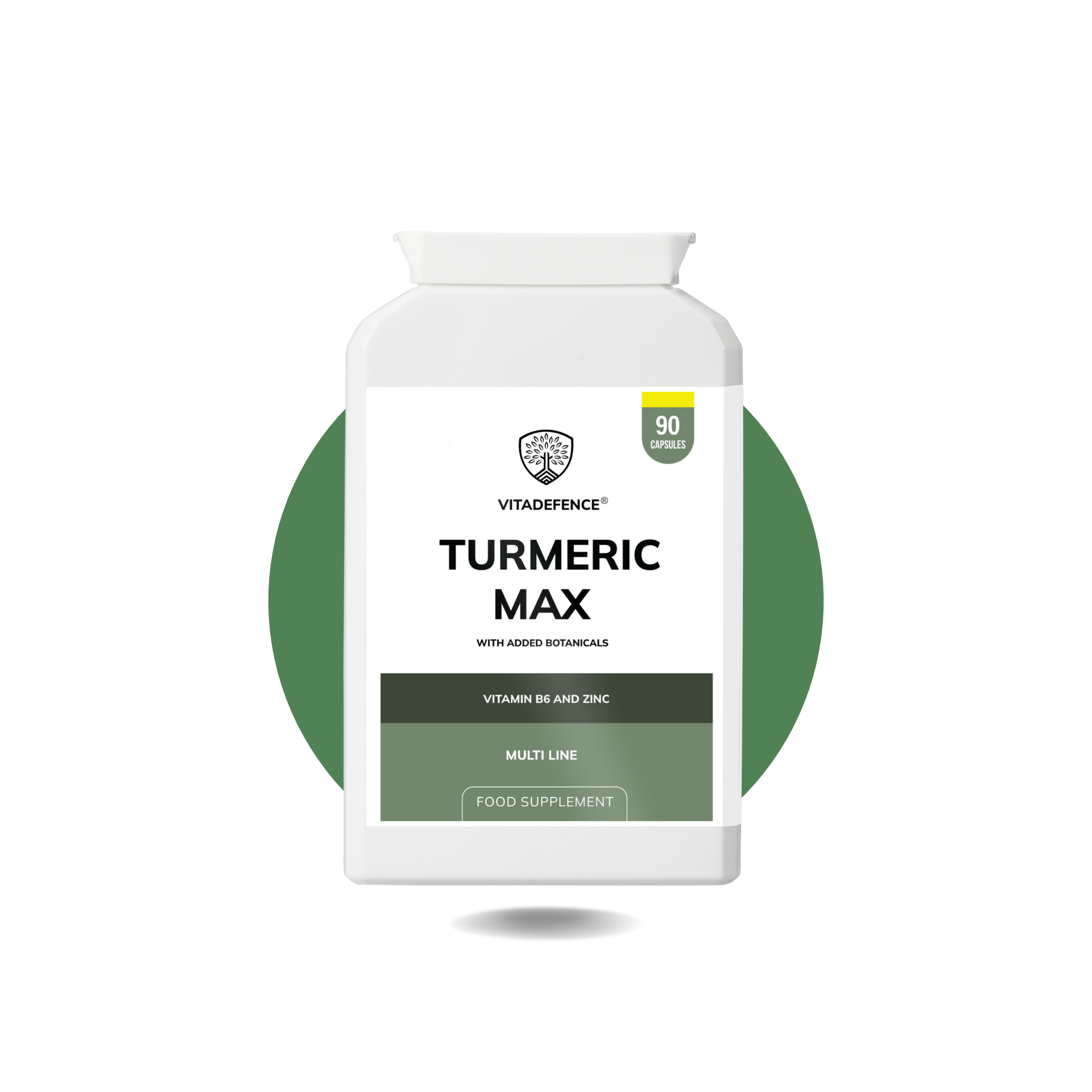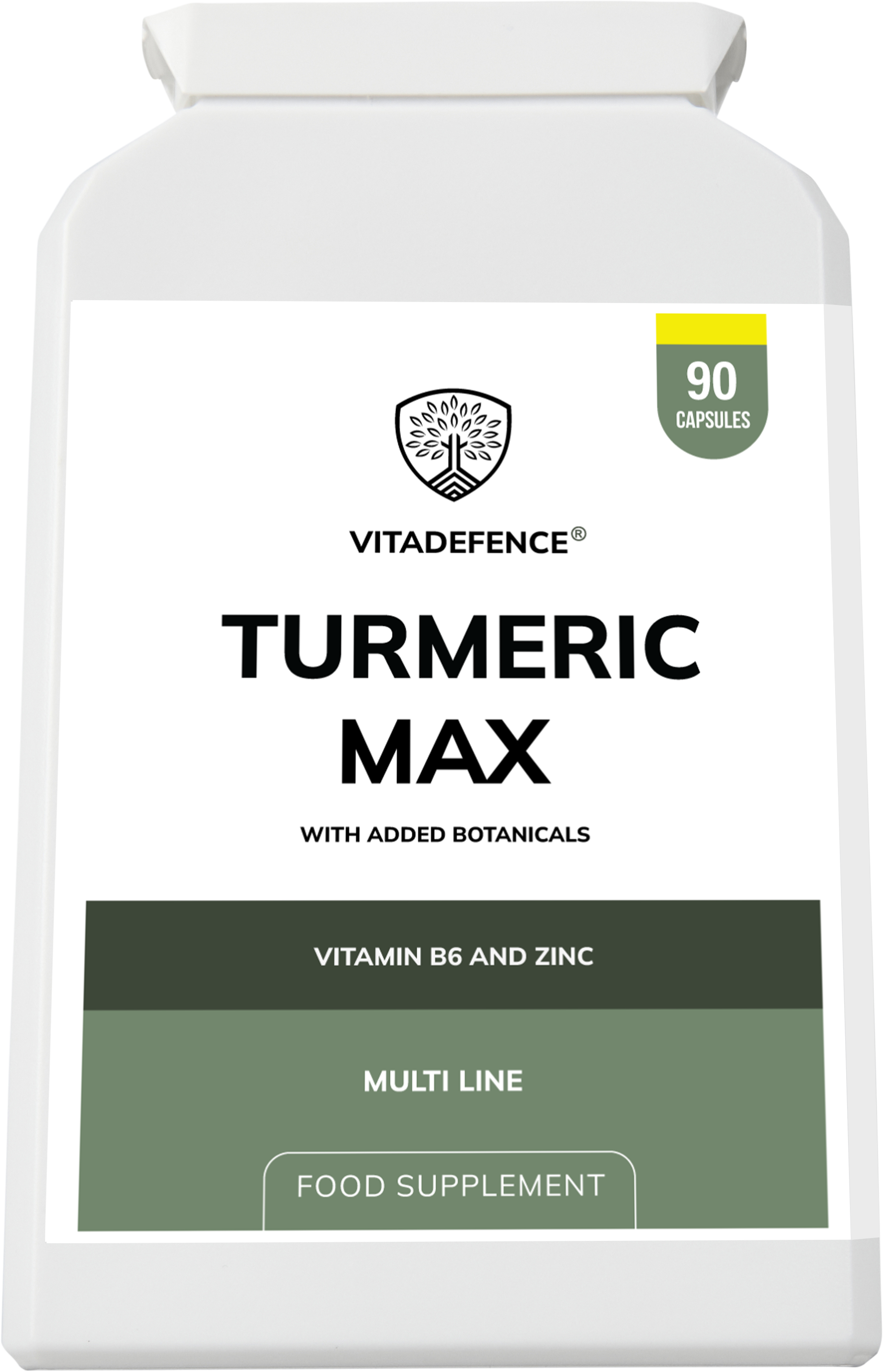 Vitadefence® Turmeric Max is a vegan capsule food supplement, manufactured in the UK to GMP standards. This advanced botanical formula combines organic turmeric root and extract with ginger, cayenne, and bamboo, together with vitamin B6 and zinc. Zinc contributes to the normal function of the immune system, the protection of cells from oxidative stress, acid-base metabolism, macronutrient metabolism, and the maintenance of normal nails, skin, hair, vision, bones, and cognitive function. Vitamin B6 contributes to the regulation of hormonal activity, the reduction of tiredness and fatigue, and the normal functioning of the nervous and immune systems.