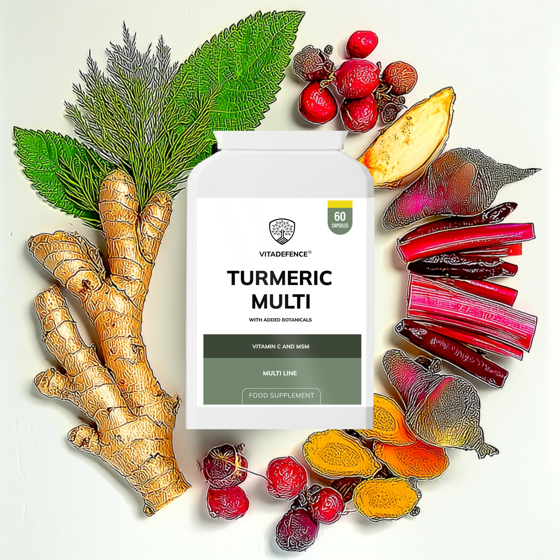 Vitadefence® Turmeric Multi is a vegan capsule food supplement, manufactured in the UK to GMP standards. This multi-ingredient formula combines turmeric root extract (providing 150 mg curcuminoids) with organic turmeric root, ginger root, bamboo extract, cayenne pepper, and black pepper, alongside vitamin B6 and zinc. Zinc contributes to the normal function of the immune system, the protection of cells from oxidative stress, acid-base metabolism, macronutrient metabolism, and the maintenance of normal skin, hair, nails, bones, vision, and cognitive function. Vitamin B6 contributes to the regulation of hormonal activity, the reduction of tiredness and fatigue, and normal immune, nervous, and energy-yielding metabolism.
