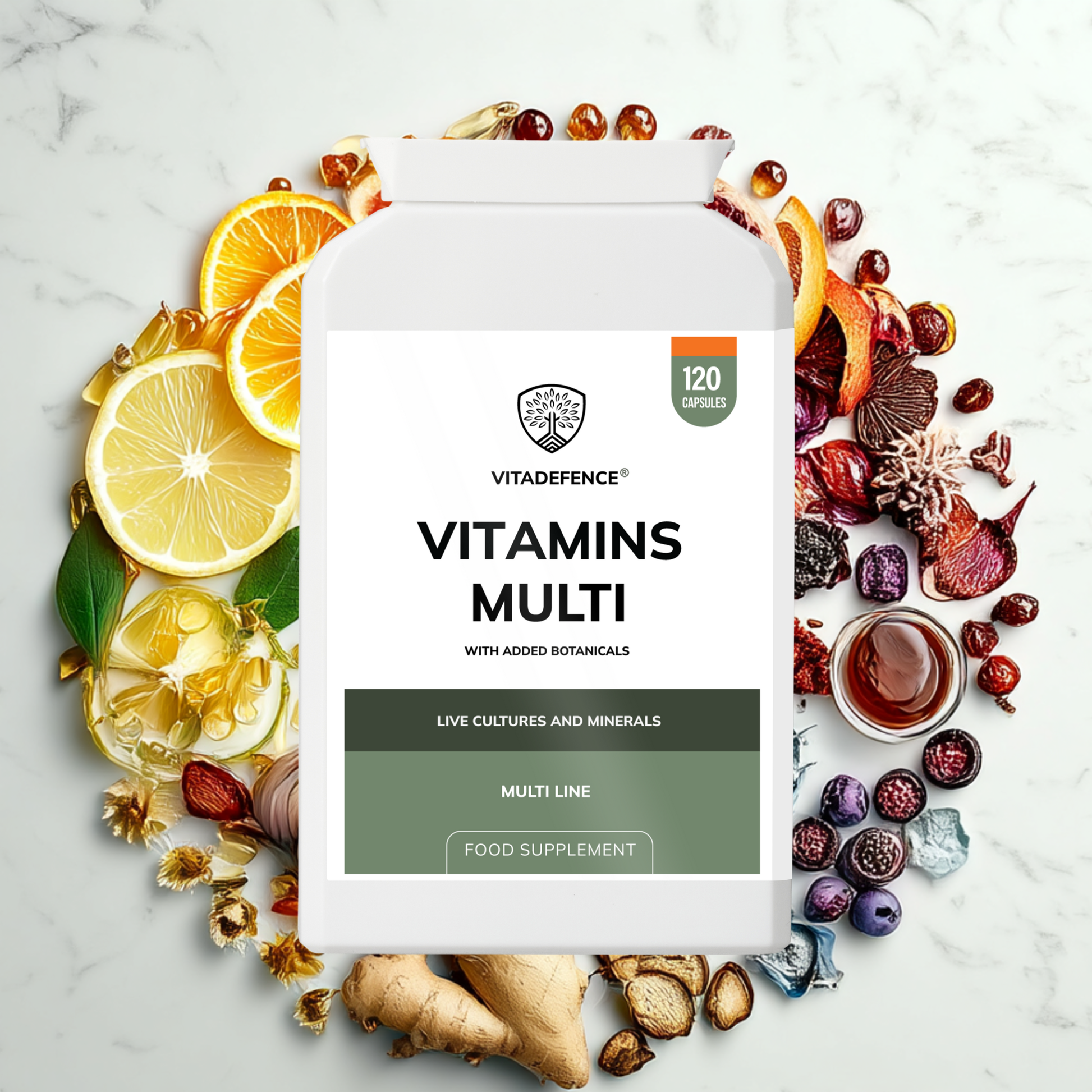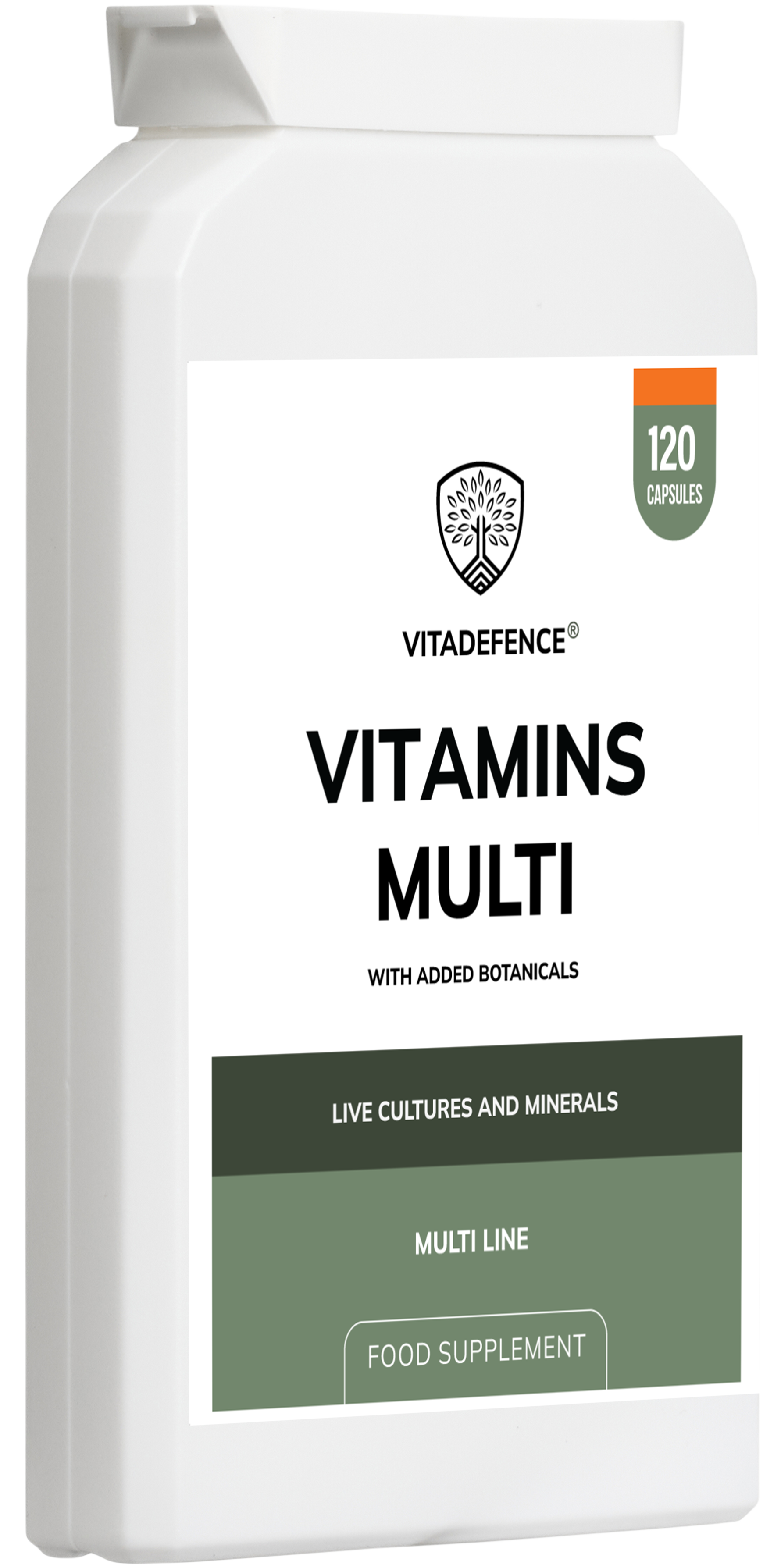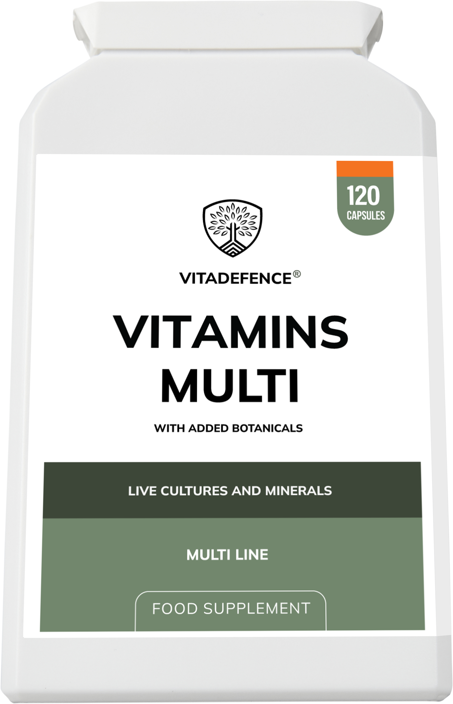 Vitadefence Vitamins Multi provides a broad spectrum of essential vitamins, minerals, botanicals, and live cultures.