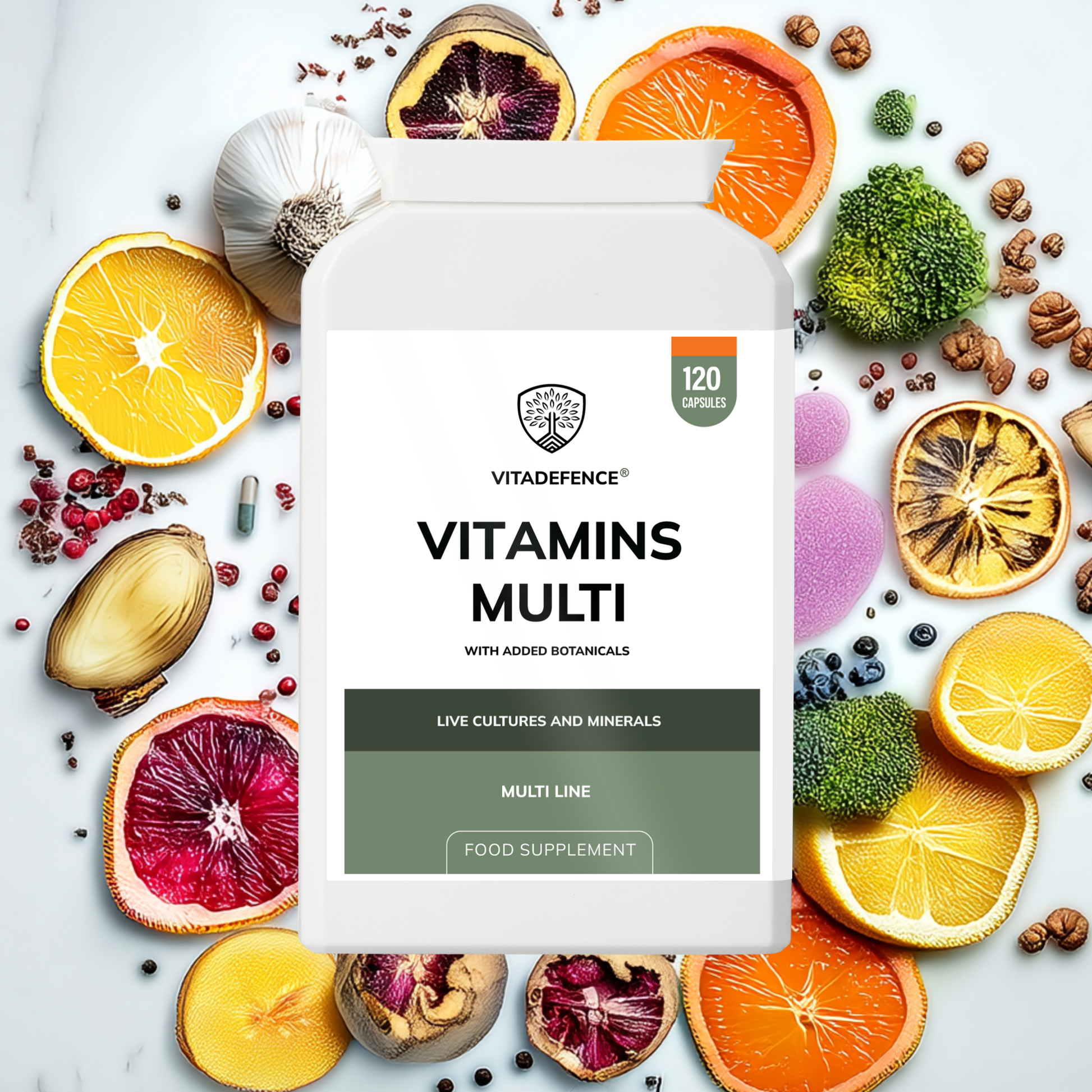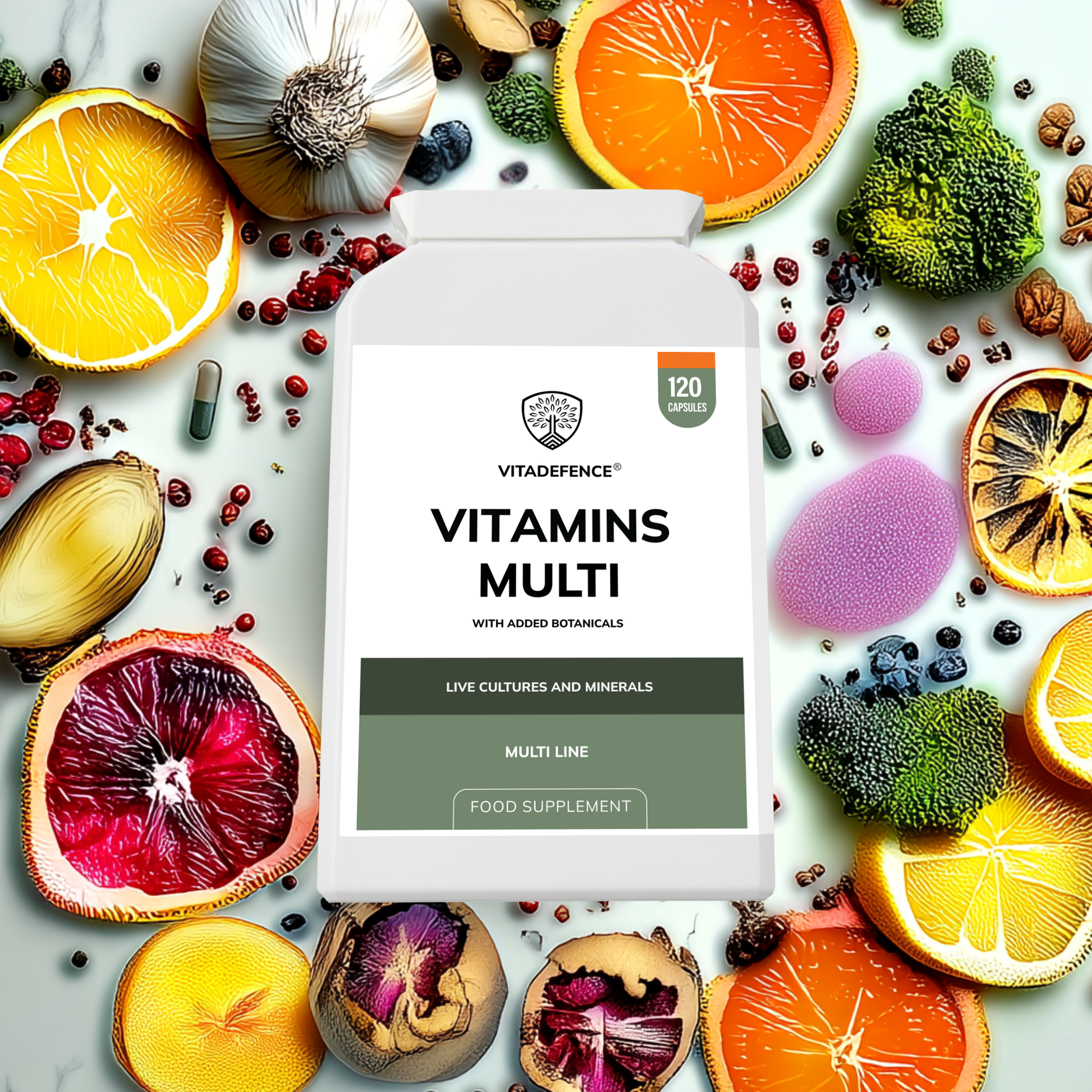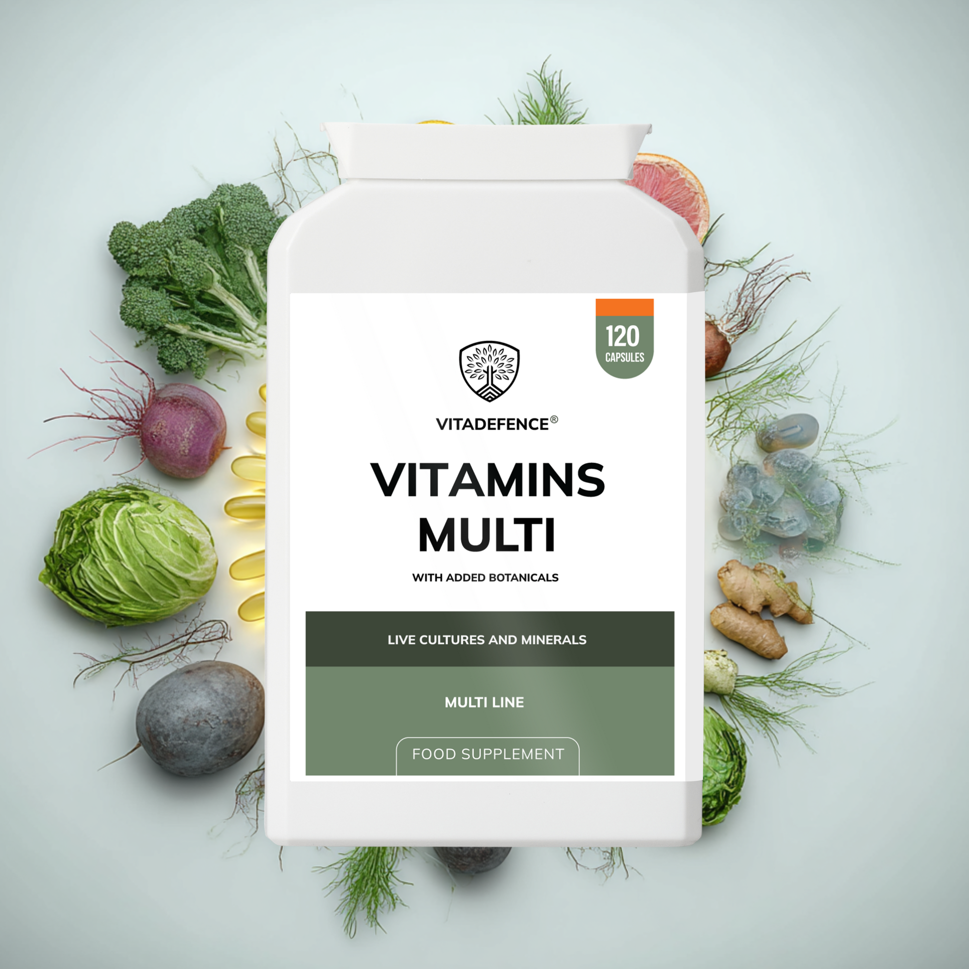 Vitadefence Vitamins Multi provides a broad spectrum of essential vitamins, minerals, botanicals, and live cultures.